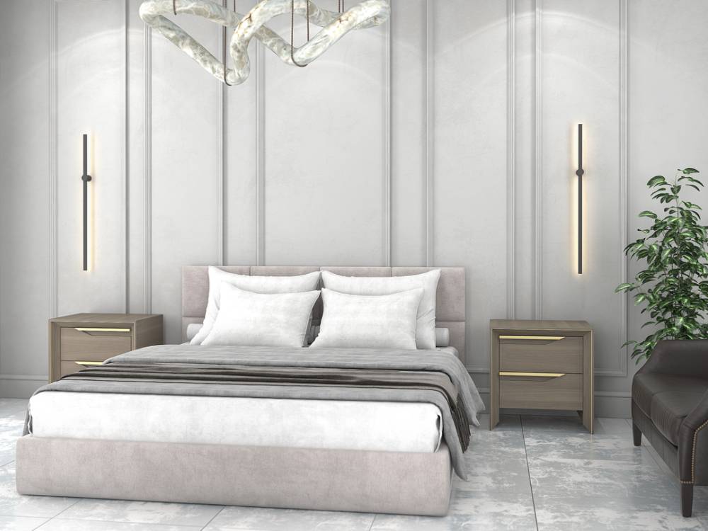 Настоящее произведение дизайнерского искусства. Кровать с мягким изголовьем изящной формы. Парящая кровать с интересной формой изголовья, напоминающей...