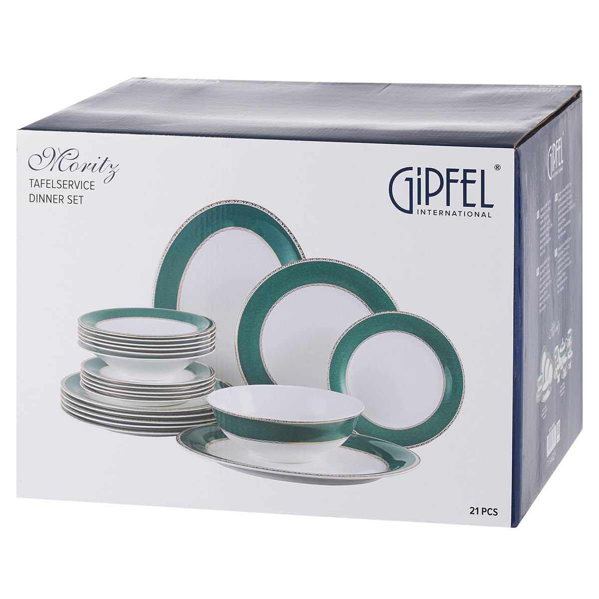 43252 GIPFEL Сервиз столовый MORITZ 21 пр.: тарелка суповая 21 см (6 шт.), тарелка обеденная 28 см (6 шт.), тарелка закусочная 21 см (6 шт.), тарелка сервировочная 37х28 см (2 шт.), салатник 1700 мл . Материал: костяной фарфор. Цвет: бирюзовый.