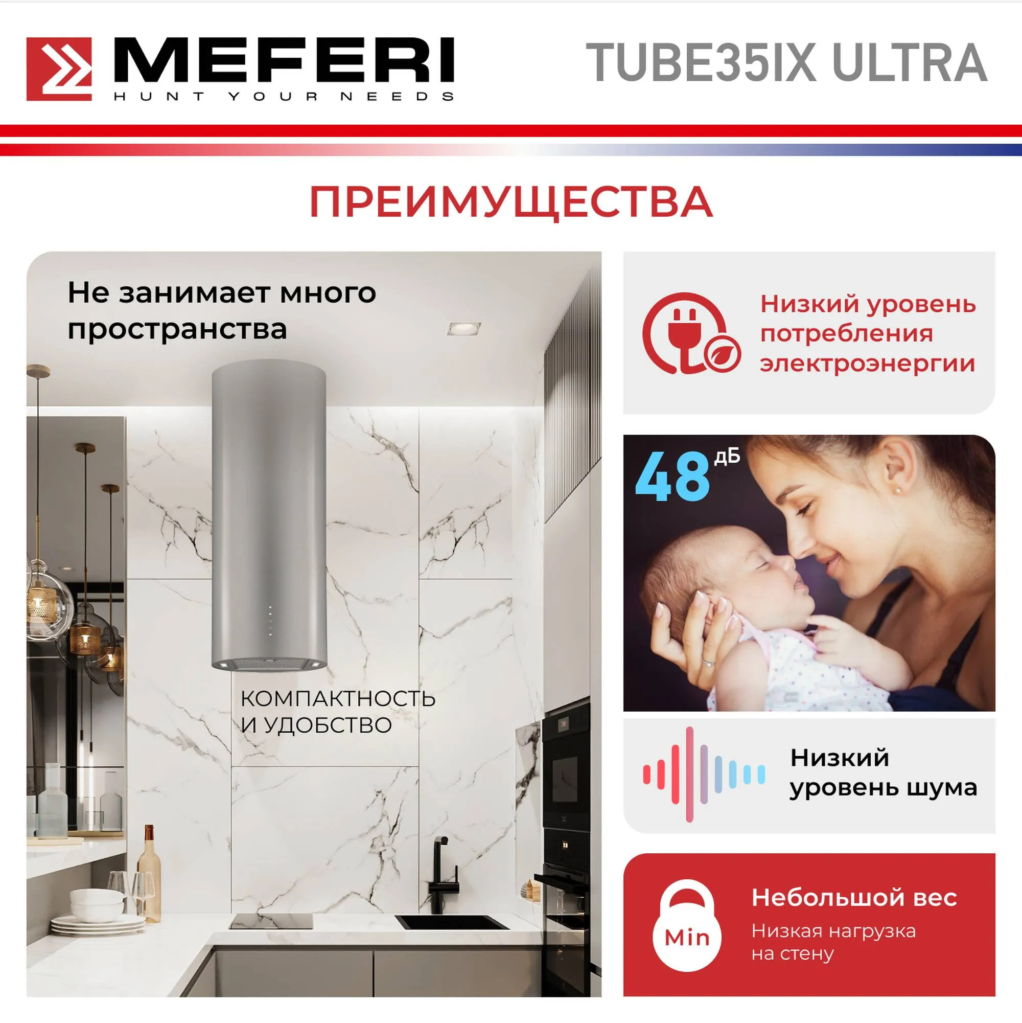 Рекомендованная площадь кухни 40 кв. м: Вытяжка MEFERI TUBE35 ULTRA идеально подходит для просторных кухонь, обеспечивая высокую производительность и чистоту воздуха.