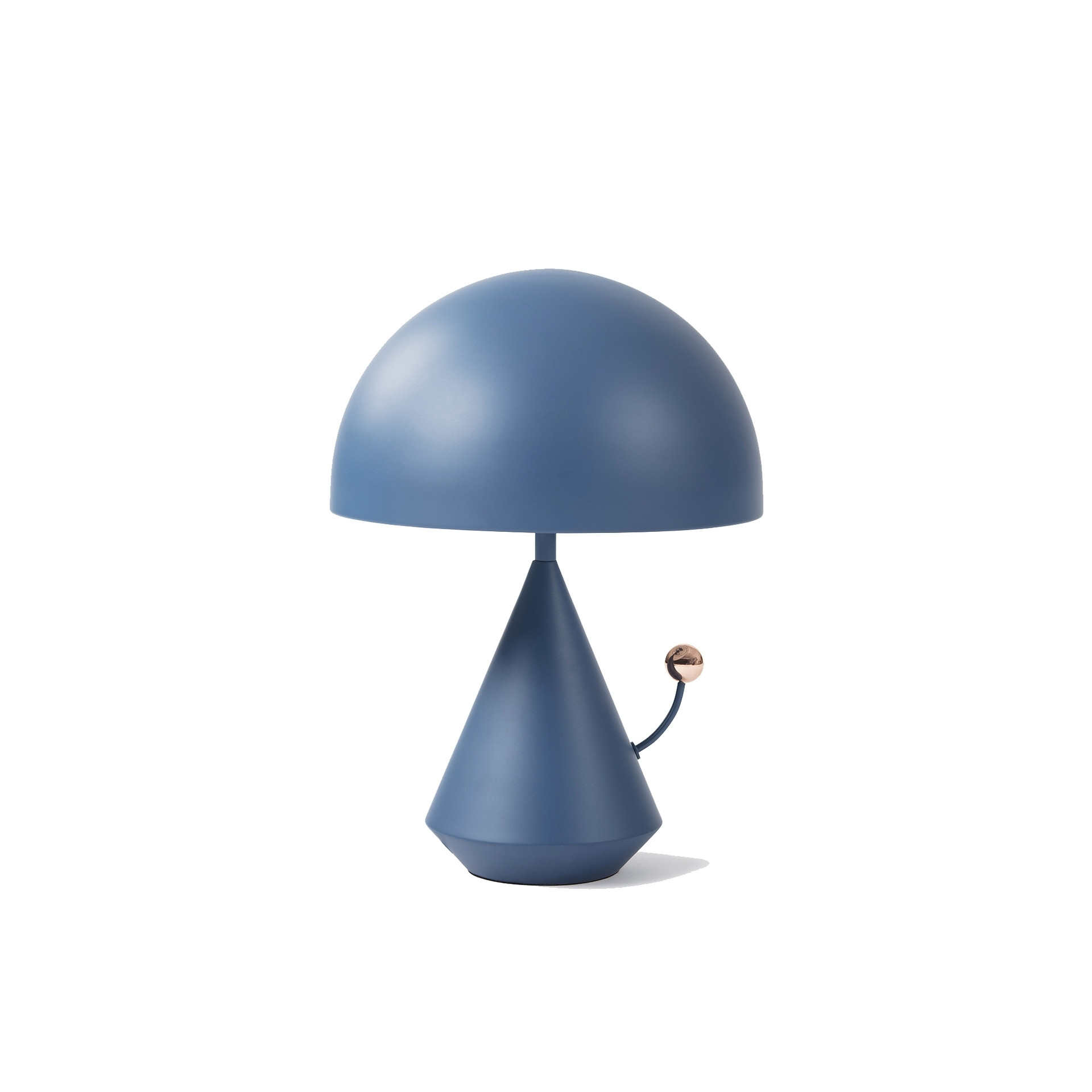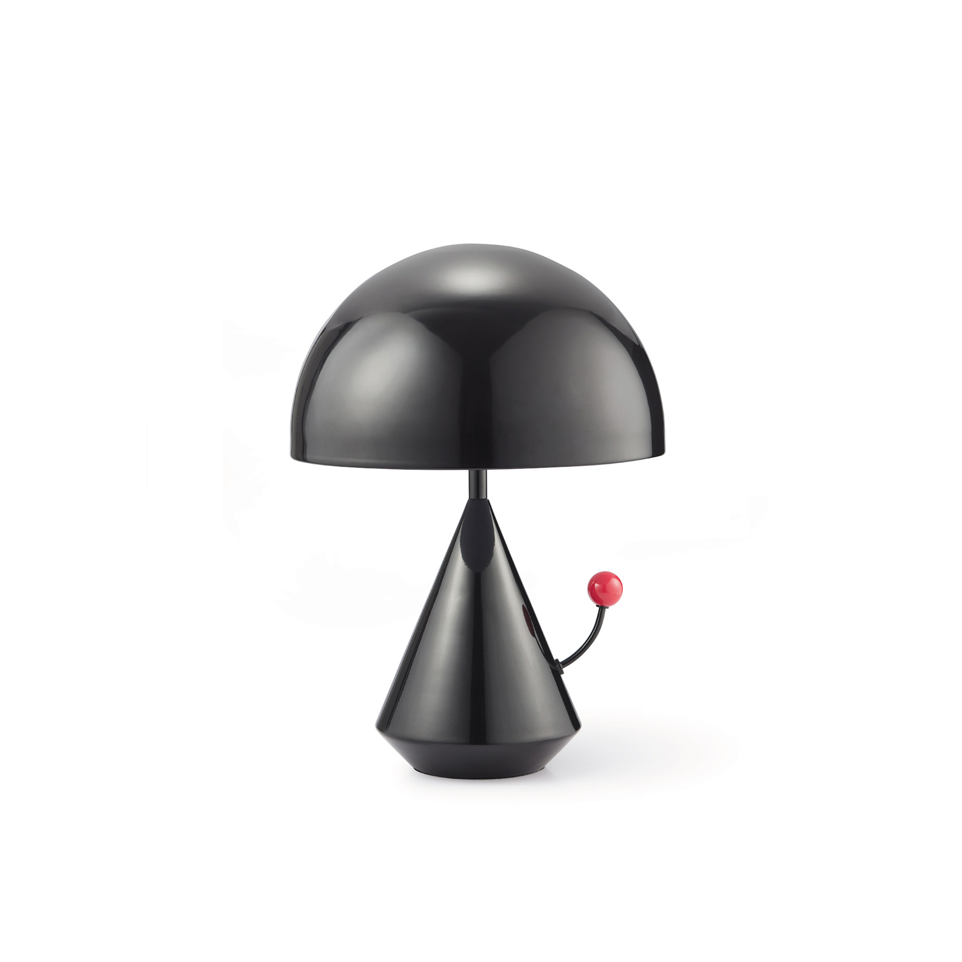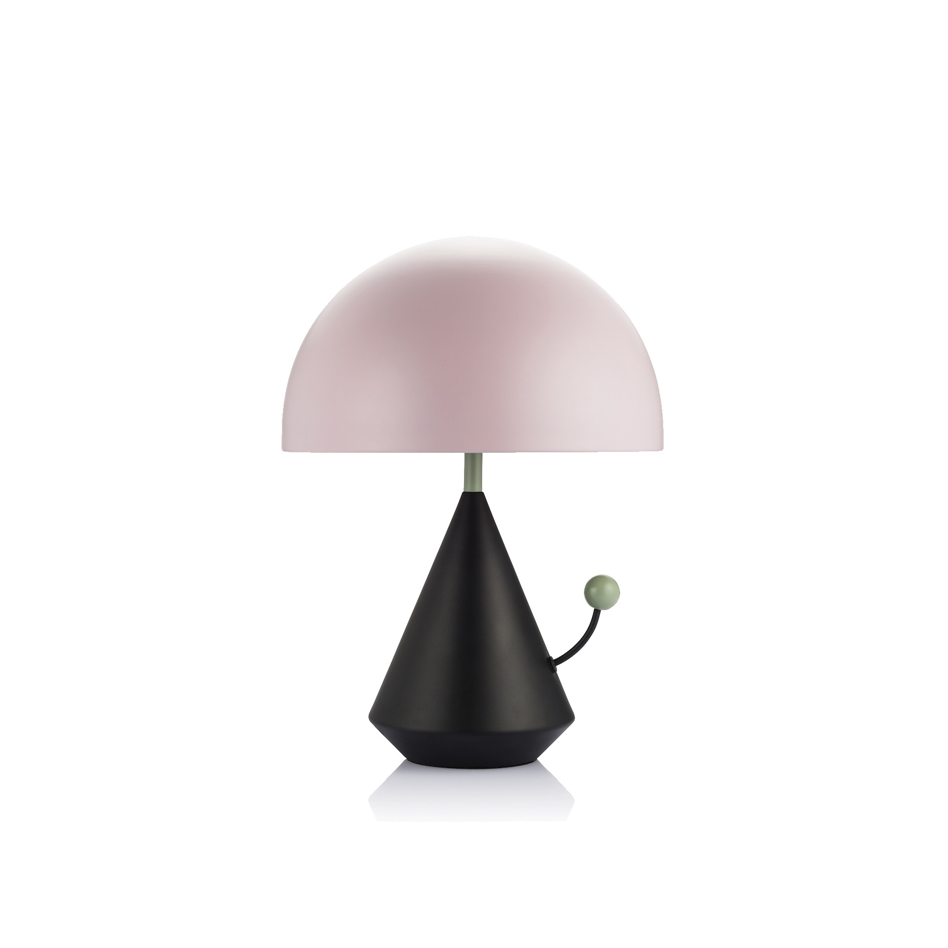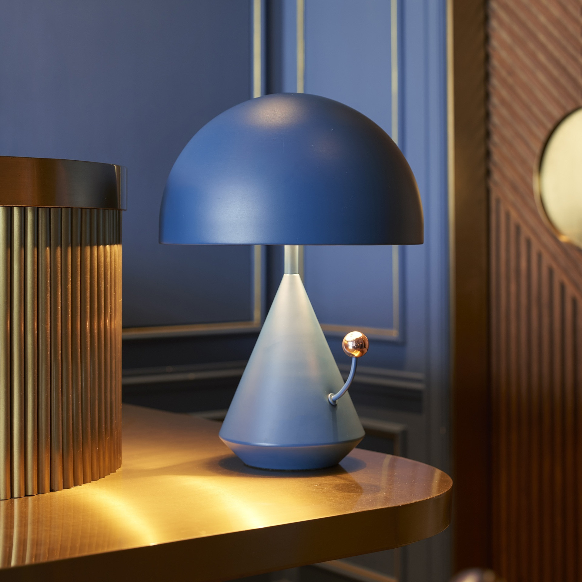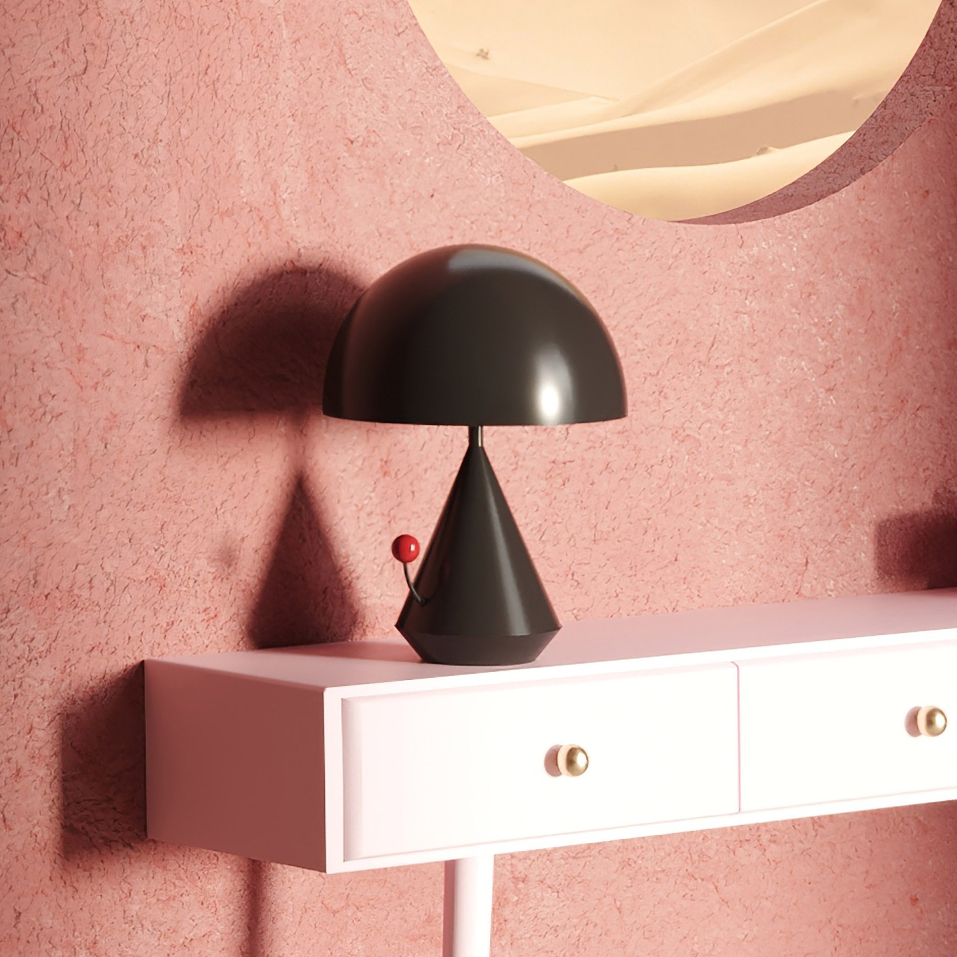 Основание в форме пирамиды поддерживает изящный куполообразный абажур, а миниатюрный металлический шарик на ножке служит сенсорным выключателем — достаточно лёгкого прикосновения. Лампа словно «вишенка на торте» в интерьере: она добавляет пространству ироничную нотку и становится выразительным декоративным акцентом.