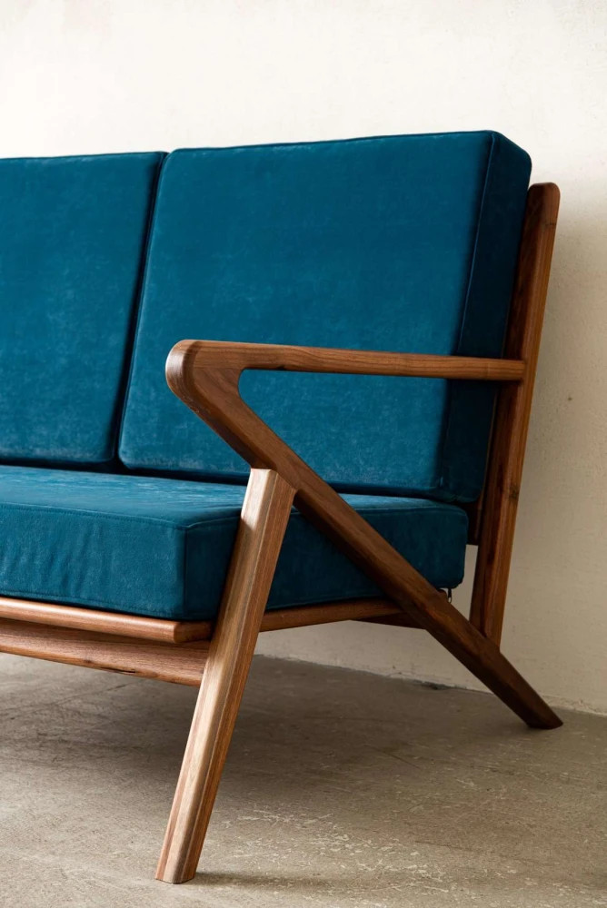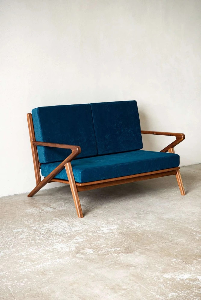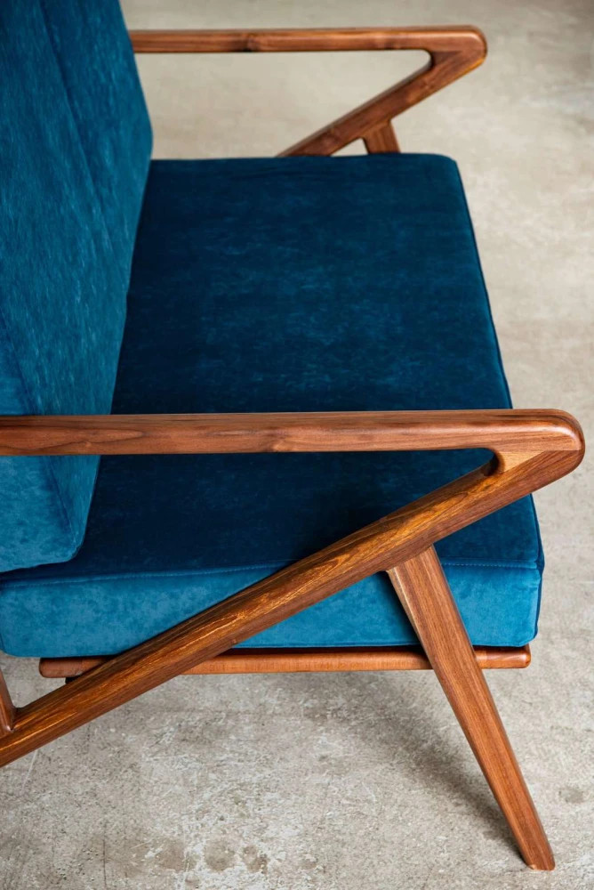 Диван Натив — это компактный двухместный диван с мягкой посадкой и обивкой глубокого синего оттенка. Он продолжает эстетику коллекции «По своей природе», где сочетаются минимализм, натуральные материалы и внимание к деталям. Благодаря лаконичному силуэту и изящному деревянному каркасу из ореха, диван смотрится визуально лёгким, но остаётся устойчивым и надёжным.