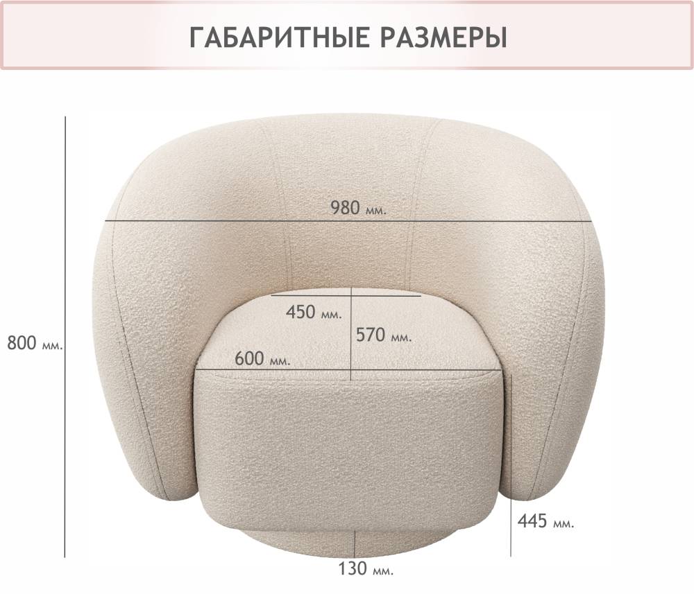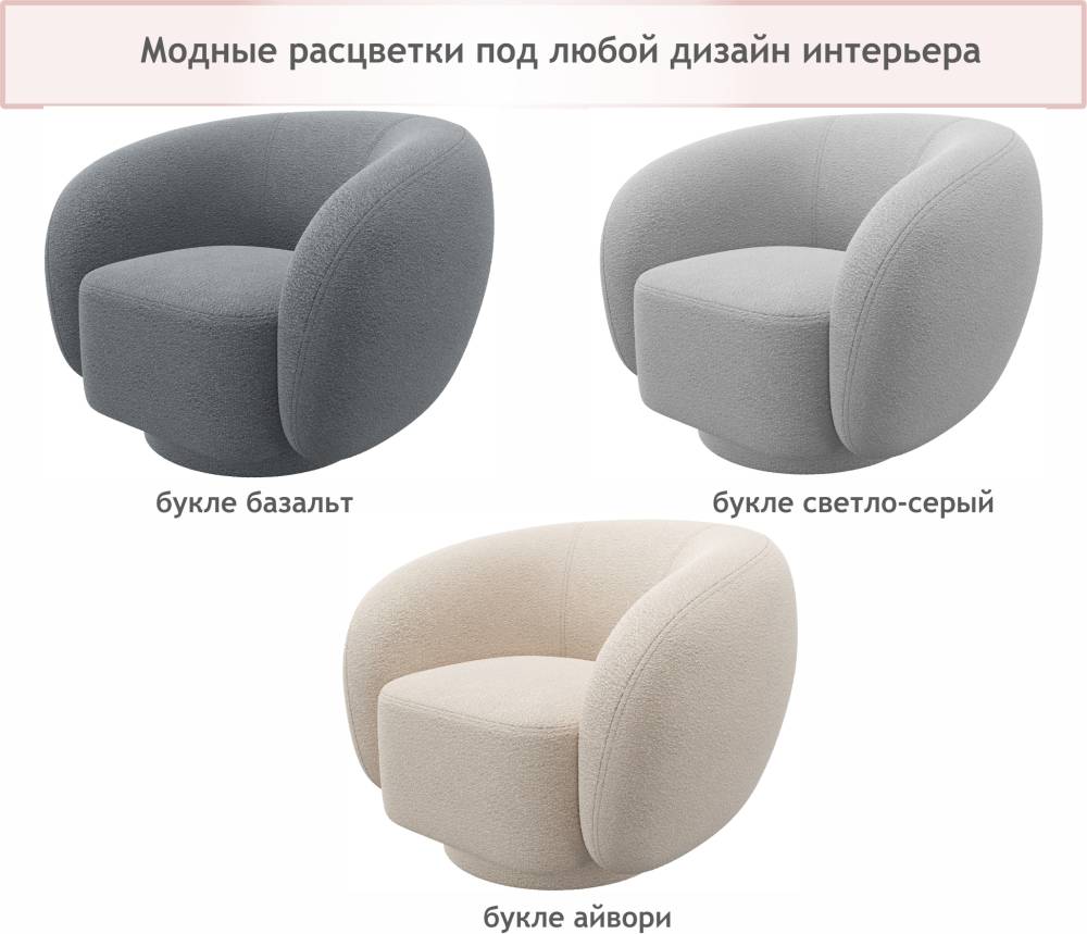 Мягкое интерьерное кресло может быть выполнено в различных цветовых вариантах из высокопрочного мебельного материала – букле. Букле - тренд этого года. Это уникальный, очень мягкий, износостойкий материал. Сохраняет первоначальный вид кресла без потери качества и цвета очень долгое время.