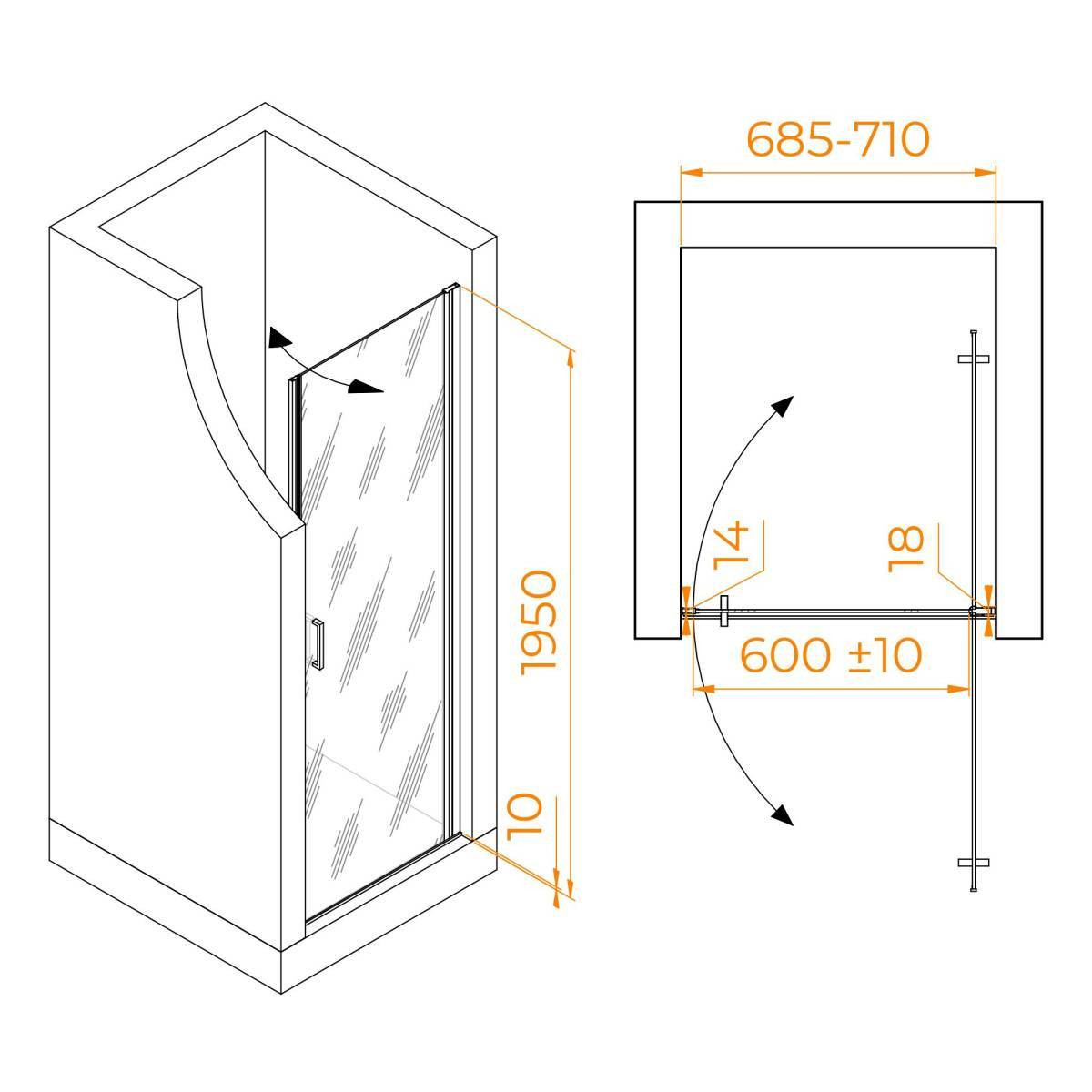 Душевая дверь изготовлена из стекла толщиной 6 мм, обеспечивающего превосходную прочность и долговечность. Прозрачный цвет стекла создает современный и открытый вид, а серый цвет профиля добавляет нотку элегантности. Общая высота двери составляет 1950 мм, что делает ее подходящей для большинства стандартных душевых кабин.