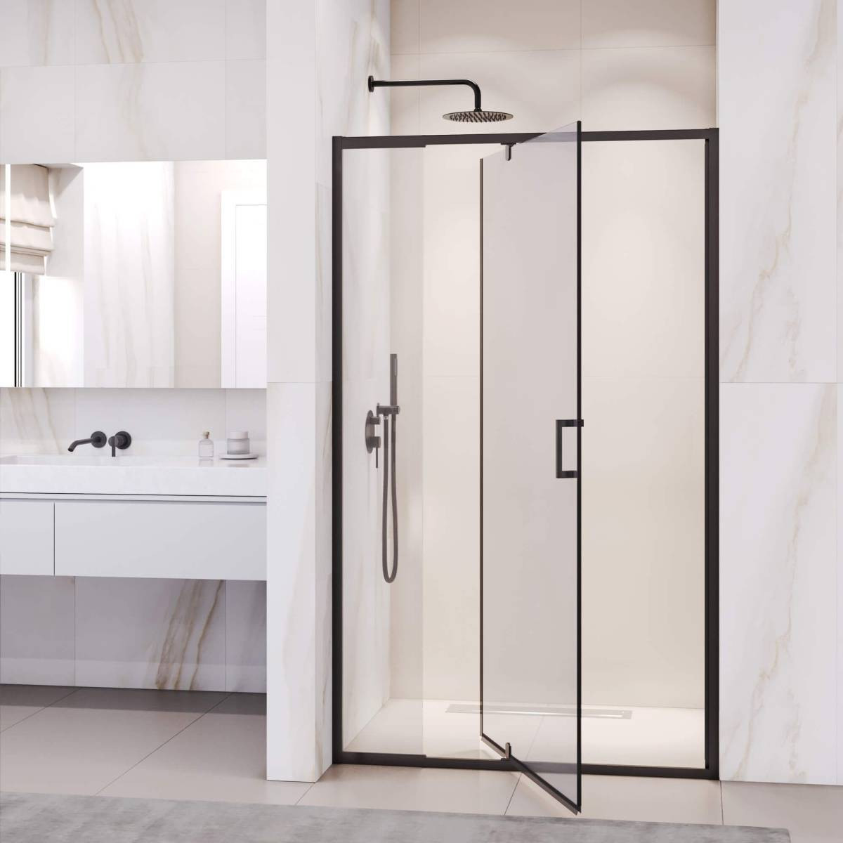 Профиль двери выполнен из анодированного алюминия черного цвета. Он обеспечивает надежную фиксацию стекла и придает конструкции дополнительную прочность. Конструкция дверей - распашные, что позволяет легко и удобно заходить и выходить из душевого помещения.