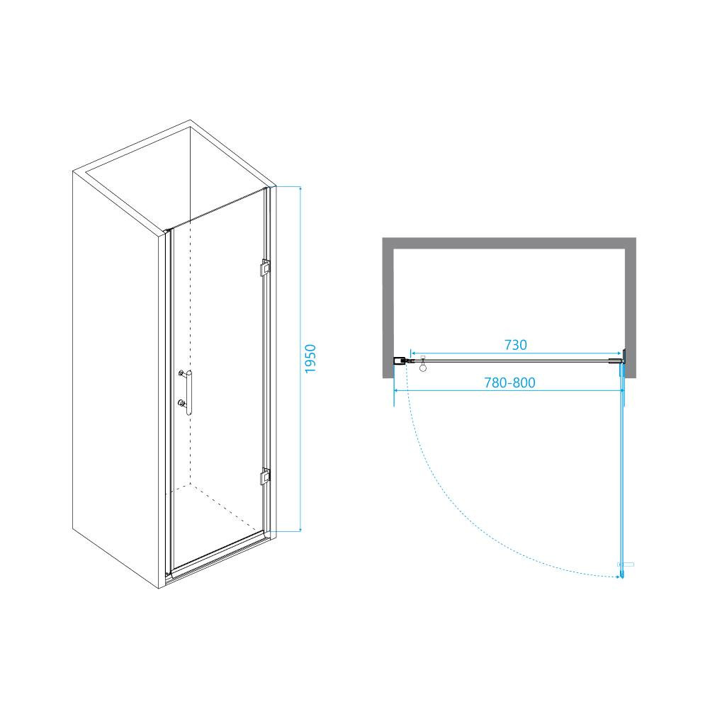 Душевая дверь состоит из одного полотна стекла «Дверь», при открытии образует широкий и свободный проход, благодаря двум элегантным прямоугольным петлям типа стена-стекло.