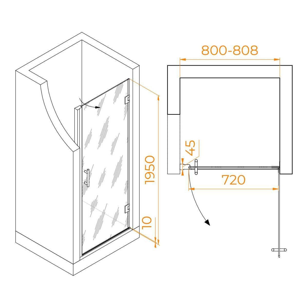 Эта душевая дверь общей высотой 1950 мм обеспечивает достаточно места и комфорта. Он оснащен механизмом распашной двери, обеспечивающим легкий доступ и плавный переход в душевую кабину. Дверцы с магнитным уплотнением обеспечивают плотное и надежное закрытие, предотвращая утечку воды.