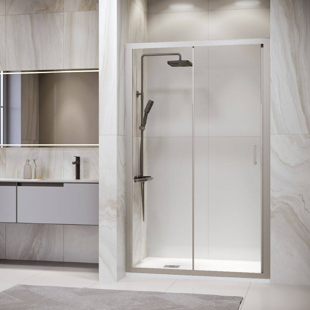 Толщина стекла двери составляет 6 мм и обладает высокой прочностью. Материал стекла выбран прозрачный, что позволяет сохранить пространственную свободу и прозрачность в ванной комнате. Цвет профиля двери выполнен в хромированном исполнении.