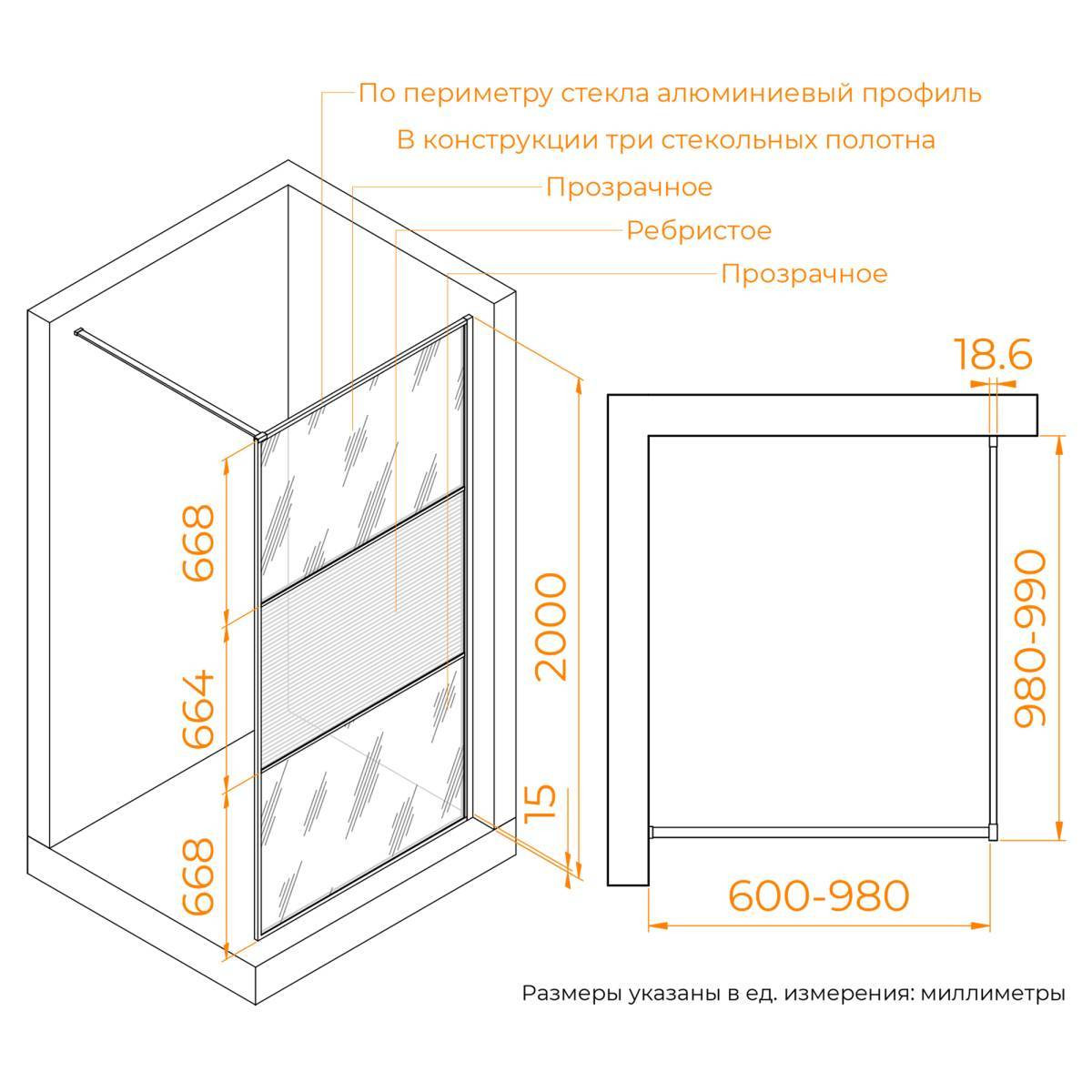 Душевая перегородка состоит из 3-х стекольных полотен (8мм), которые обрамлены изящным анодированным алюминиевым профилем!