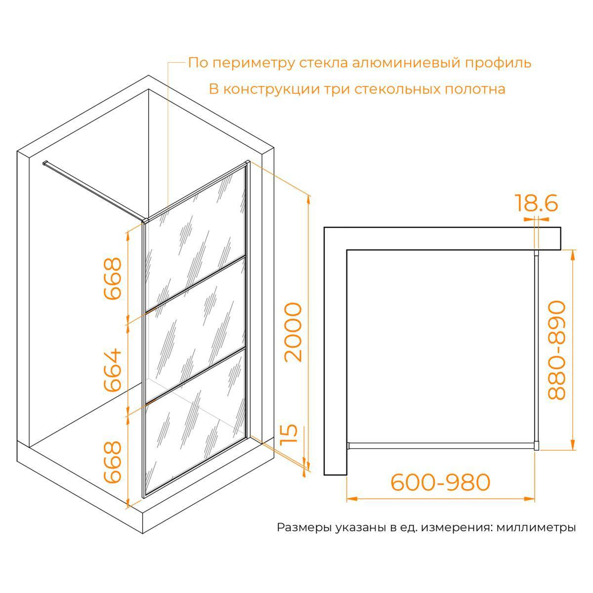 Душевая перегородка состоит из 3-х стекольных полотен (8мм), которые обрамлены изящным анодированным алюминиевым профилем!