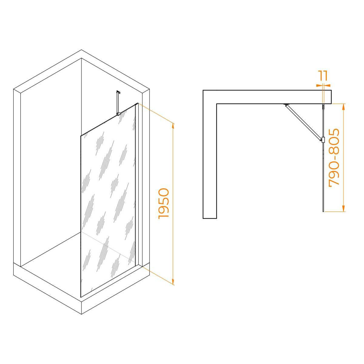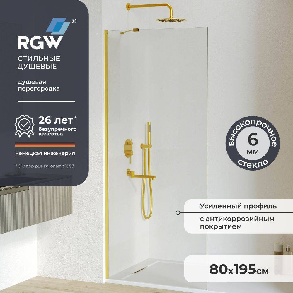 Профиль имеет цвет золото браш, что придает перегородке для душа современный и элегантный вид. Высота перегородки составляет 195 см, что обеспечивает комфортное использование для большинства пользователей.