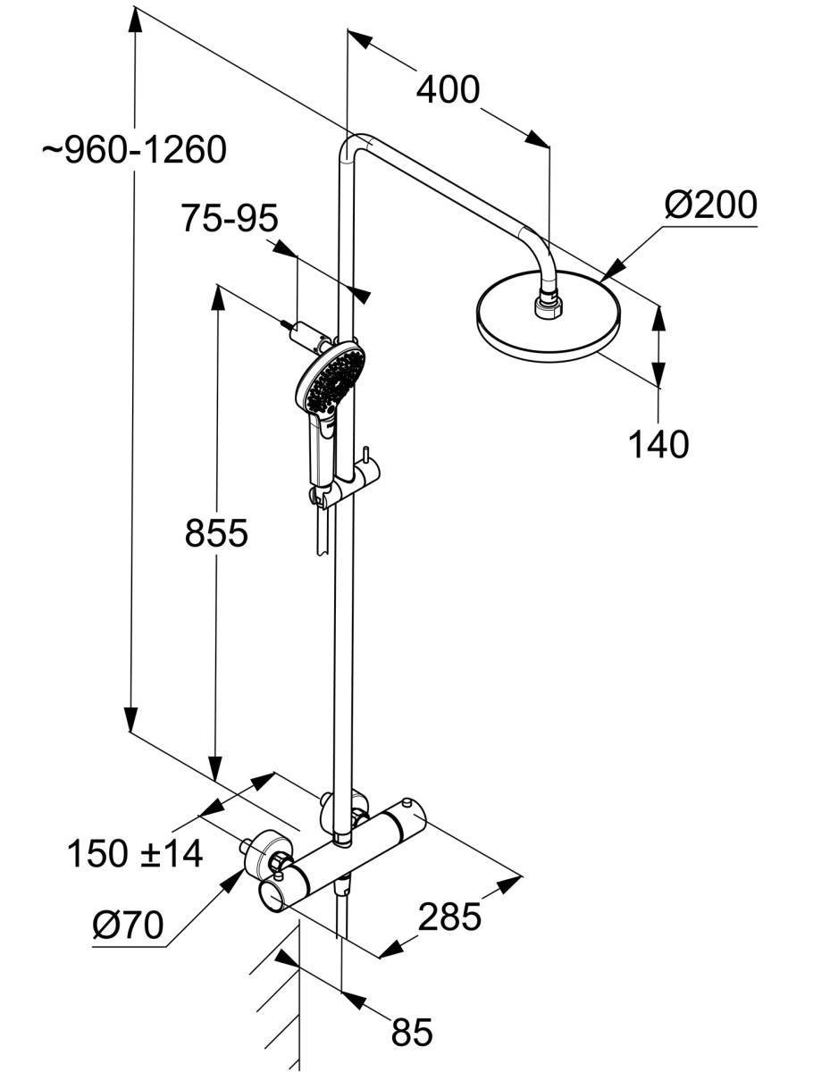 Диапазон регулировки: высота кронштейна 0-300 мм; поворот кронштейна 360°; верхний душ 10°