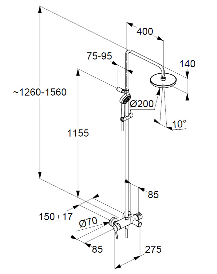 Диапазон регулировки: высота кронштейна 0-300 мм; поворот кронштейна 360°; верхний душ 10°