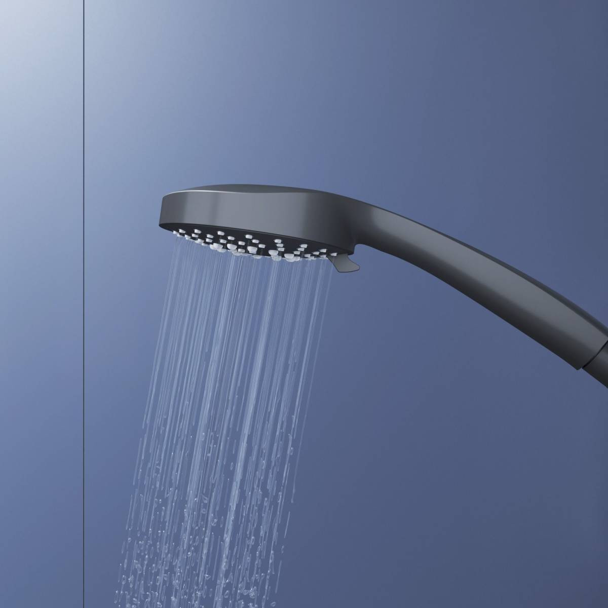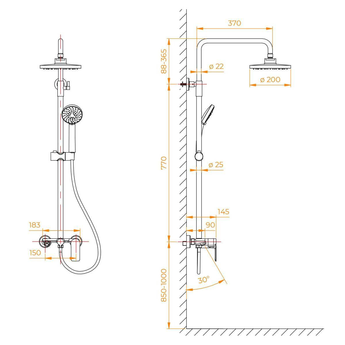 Комплектация и материал исполнения: Головной душ из высокопрочного ABS-пластика оснащён шарнирным креплением, что позволяет выбрать необходимый угол направления воды; SP-26В - шланг ручного душа из ПВХ, длина 1.5 м; Ручной душ - 3 режима работы, выполнен из высокопрочного ABS-пластика; Держатель ручного душа с регулировкой высоты; Стальная штанга с регулировкой высоты головного душа; Компактный излив; Смеситель с  керамическим картриджем и дивертором для переключение режимов, выполнении из сантехнической латуни; Быстрый настенный монтаж; Подключение: ½ дюйма; Ресурс 10 лет