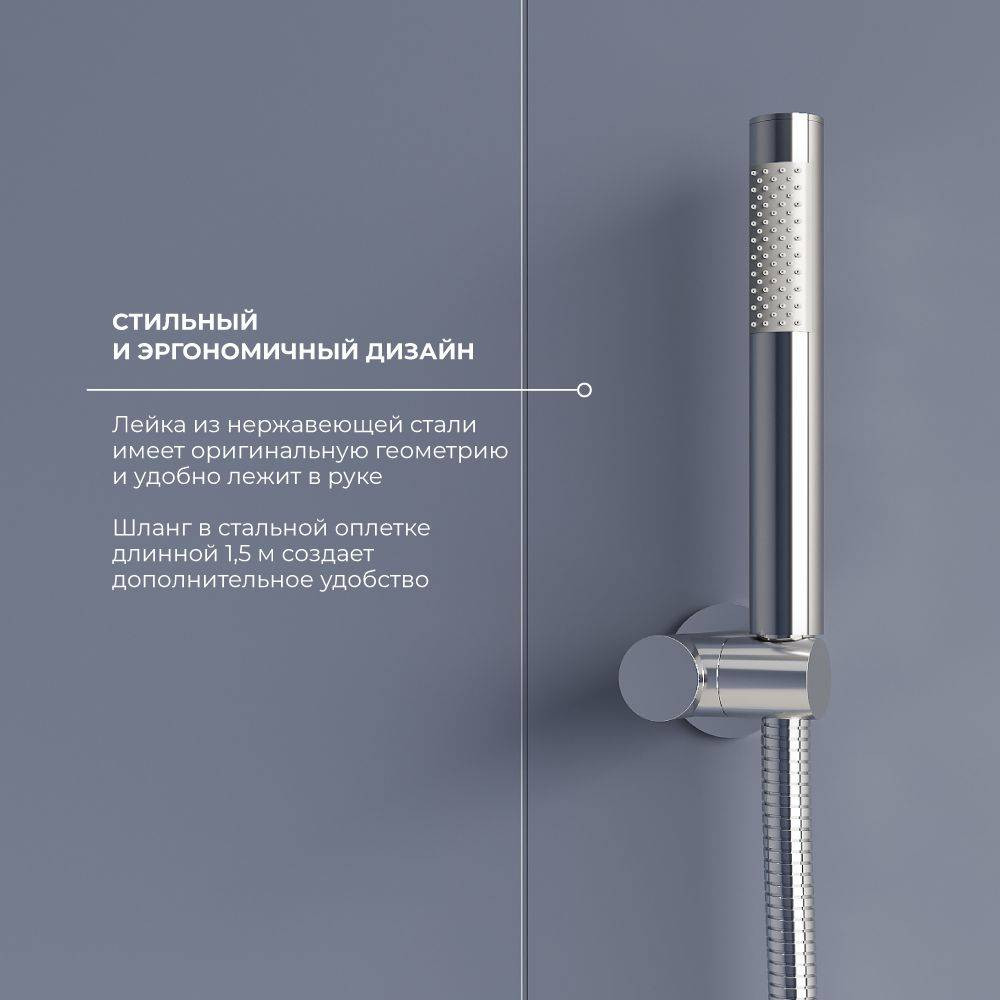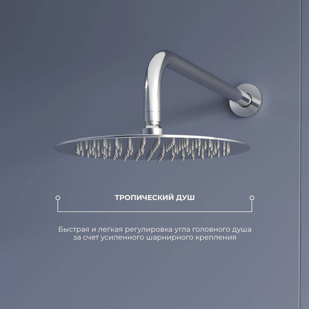 · Головной душ, горизонтальный держатель из нержавеющей стали. Головной душ оснащён шарнирным креплением, что позволяет выбрать необходимый угол направления воды