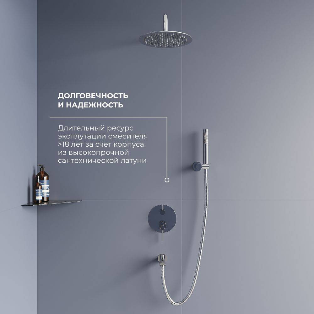 Встраиваемая душевая система выполнена из латуни и нержавеющей стали, что придаёт изделию повышенную устойчивость к образованию коррозии и ржавчины, а внутренний элемент оснащён керамическими пластинами. За счет применения передовых технологий душевые системы рассчитаны на ресурс эксплуатации не менее 10 лет.