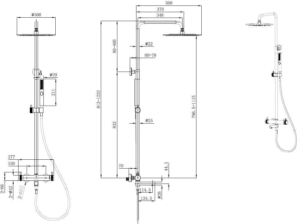 Переключатель режимов - поворотный (левая ручка), 3 положения: Верхний Душ_Выключено_Ручной Душ/Излив. Поворотный излив-дивертер, при открытом изливе включен излив, при закрытом изливе - ручной душ. Штанга-телескоп: Нержавеющая сталь