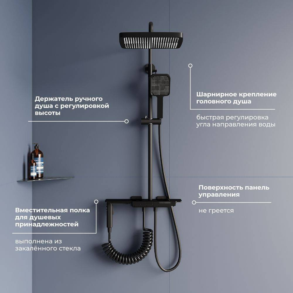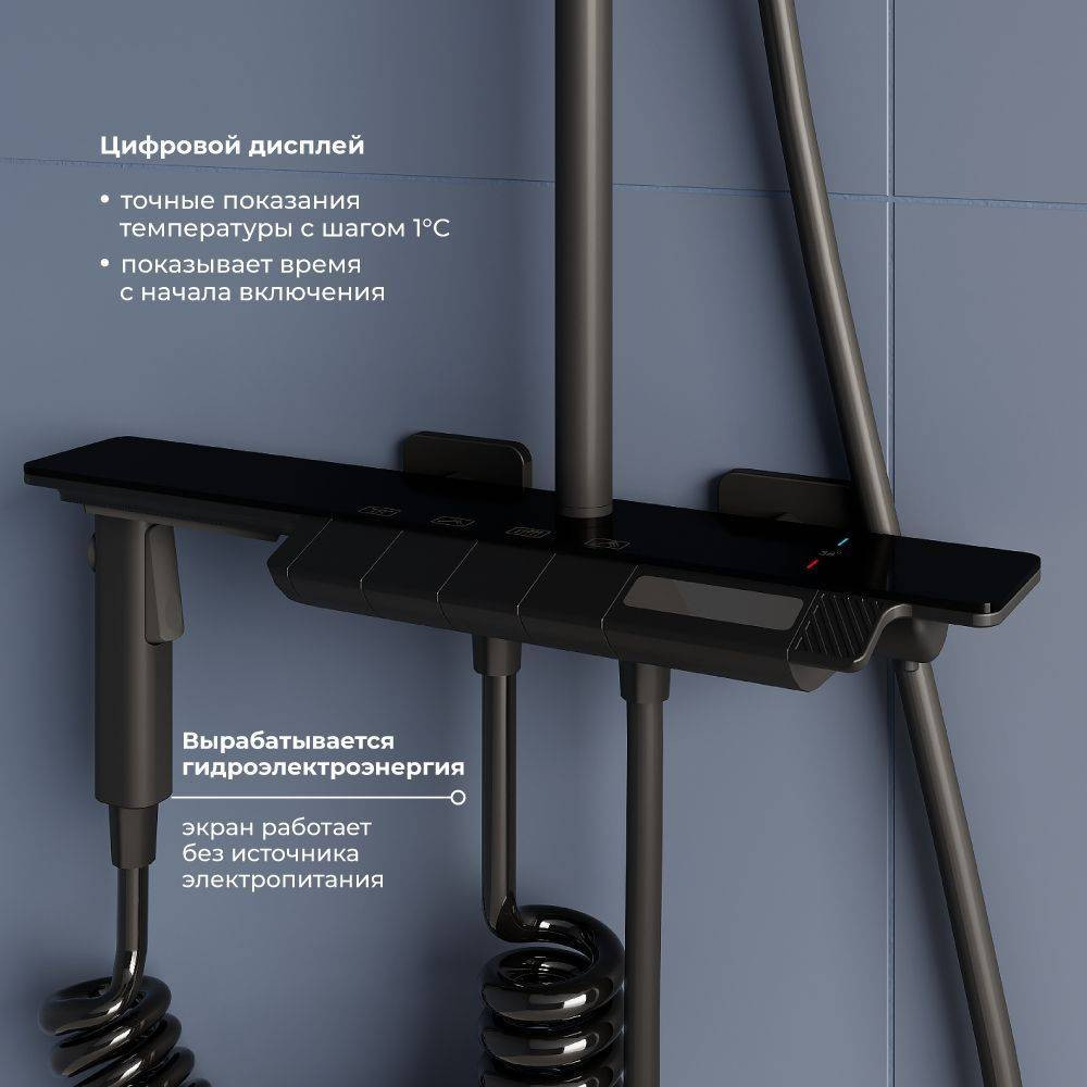 Инновационная душевая система с термостатическим смесителем и дисплеем, который показывает температуру воды.