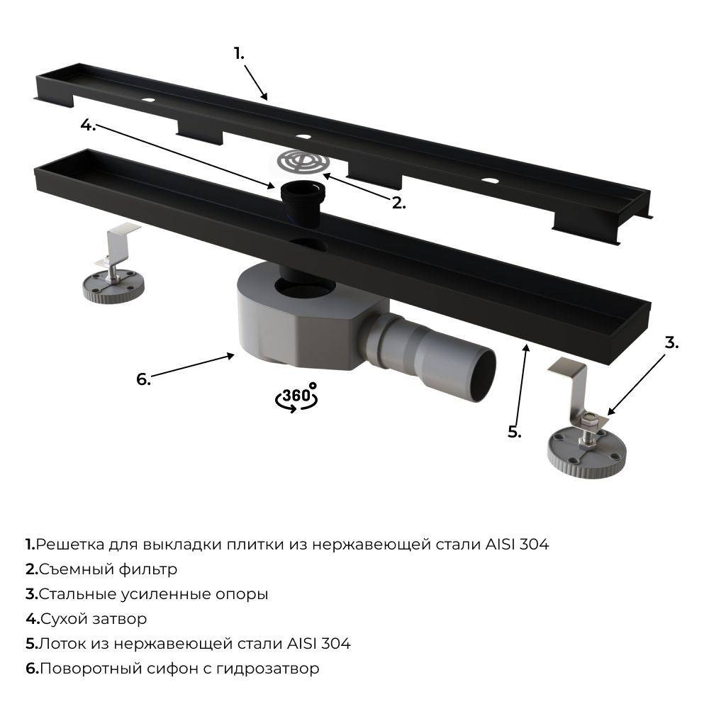 Крышка и лоток из нержавеющей стали AISI 304. Крышка для вкладки плитки. Съёмный фильтр для улавливания волос - быстрый доступ с верху для очистки. Две устойчивые опоры с регулировкой высоты (58-7Омм) для лёгкой установки. Сухой+гидро затвор — 100% защита от неприятных запахов. Съёмный переходник ⌀ 40/50 Гидроизоляционная лента Поворотный сифон для подключения с любой стороны Установка в один уровень с плиткой Монтажная высота: 58 мм Подходит для укладки плитки 8-10 мм Высокая пропускная способность 42 л/мин. обеспечит быстрый сток воды.