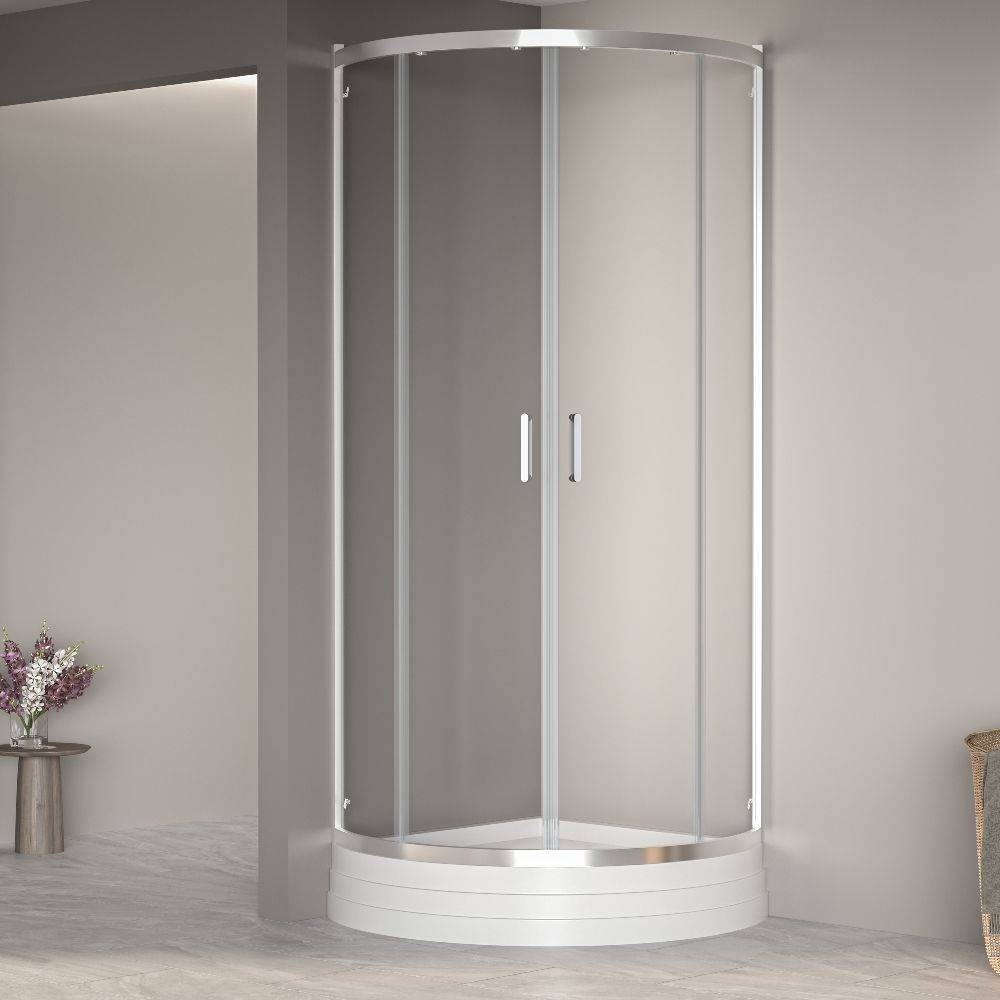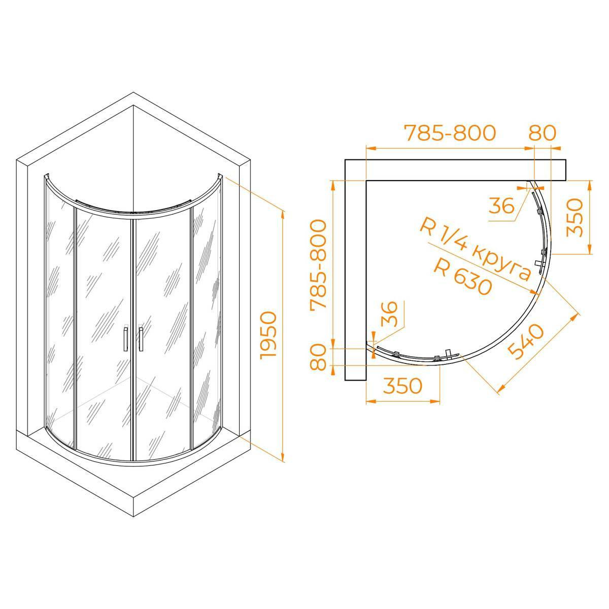 Высота общая: 1950мм Толщина стекла: 6мм Условный размер: 800x800мм Цвет стекла: Прозрачное Размеры с диапазоном регулировок: (785-800)х(785-800) Форма: Полукруглый Ширина (F): 350мм Ширина (Х): 540мм Цвет профиля: Хром Материал профиля: Анодированный алюминий Водонепроницаемые стальные петли: да Двойные регулируемые ролики: да Класс защиты герметичности : 1 класс герметичности Конструкция дверей: Раздвижные Магнитный уплотнитель двери: да Откидная дверка для лёгкой отчистки: да Покрытие стекла анти капля : Easy Clean Регулируемый профиль: да Ролики верх/низ: да Ручка: Металлическая Универсальная установка: да Ресурс эксплуатации: 15 лет Серия: PassageСтрана производитель: Россия / Германия Гарантия: 3 года Душевой уголок полукруглый, две раздвижные двери. Радиус 1/4 круга.