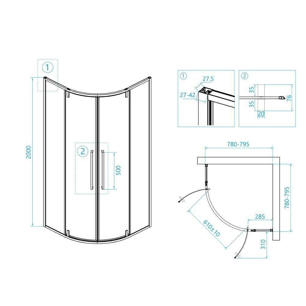 Высота душевого угла составляет 2000 мм, что создает достаточно места для большинства пользователей и придает ему максимальную удобство. 1 класс герметичности гарантирует, что достаточно пространства будет закрыто когда двери закрыты, а маятниковая конструкция дверей позволяет легко открывать и закрывать двери без затруднений.