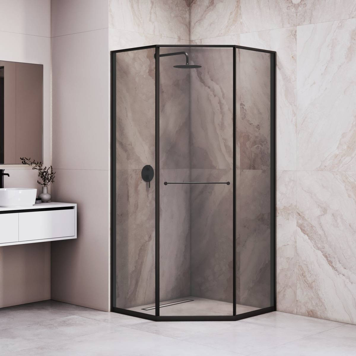 Инновационный механизм раздвижной системы при открытии плавно смещает дверь вдоль стационарного стекла при этом обеспечивая комфортный вход и просторное пространство внутри душевого угла.