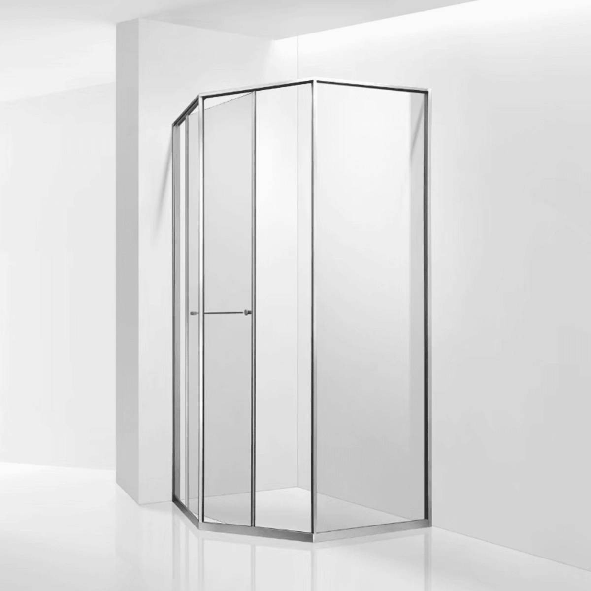 Инновационный механизм раздвижной системы при открытии плавно смещает дверь вдоль стационарного стекла при этом обеспечивая комфортный вход и просторное пространство внутри душевого угла.