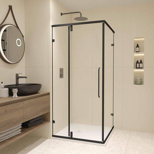 Модель представлена в чёрном исполнении профиля и фурнитуры, также обратите внимания, все уплотнители выполнены так же в чёрном цвете, что подчёркивает сдержанную стилистику душевых углов.