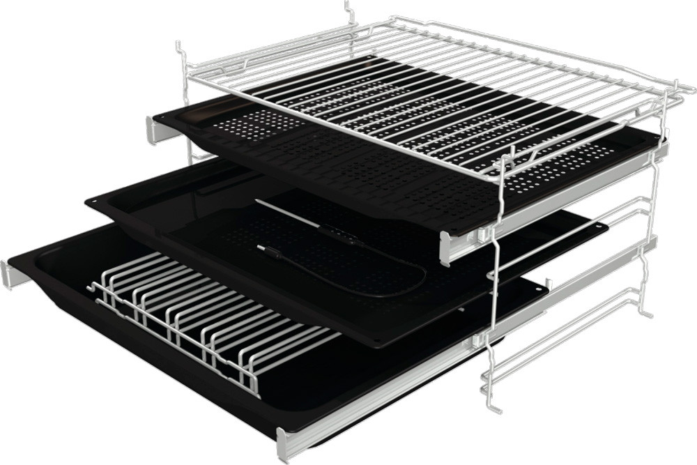Прибор оснащен температурным зондом, телескопическими направляющими на двух уровнях и множеством аксессуаров, включая решетку, противни и паровой противень. Вы сможете легко готовить, размораживать, подогревать и многое другое.