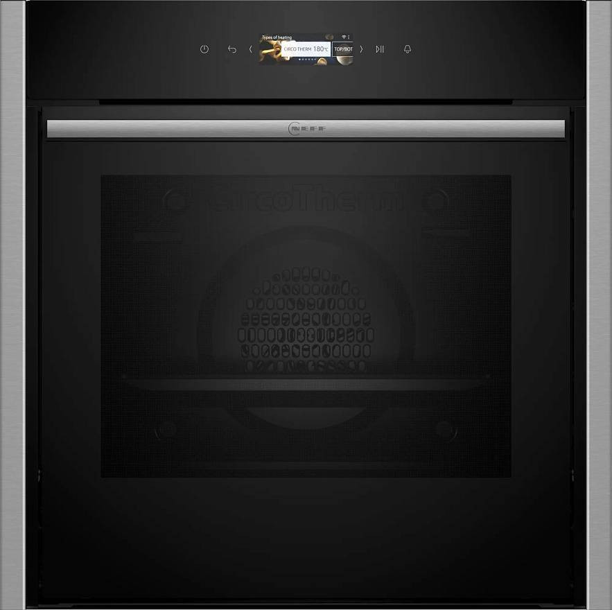 Устройство оснащено электронным контролем температуры, таймером и дисплеем. Также есть функция Home Connect, которая позволяет управлять прибором с помощью смартфона или планшета. Освещение внутри камеры обеспечивается галогенной лампой, что позволяет контролировать процесс приготовления. Духовой шкаф имеет систему охлаждения и трехслойное стекло дверцы, максимальная температура которого не превышает 40 градусов.