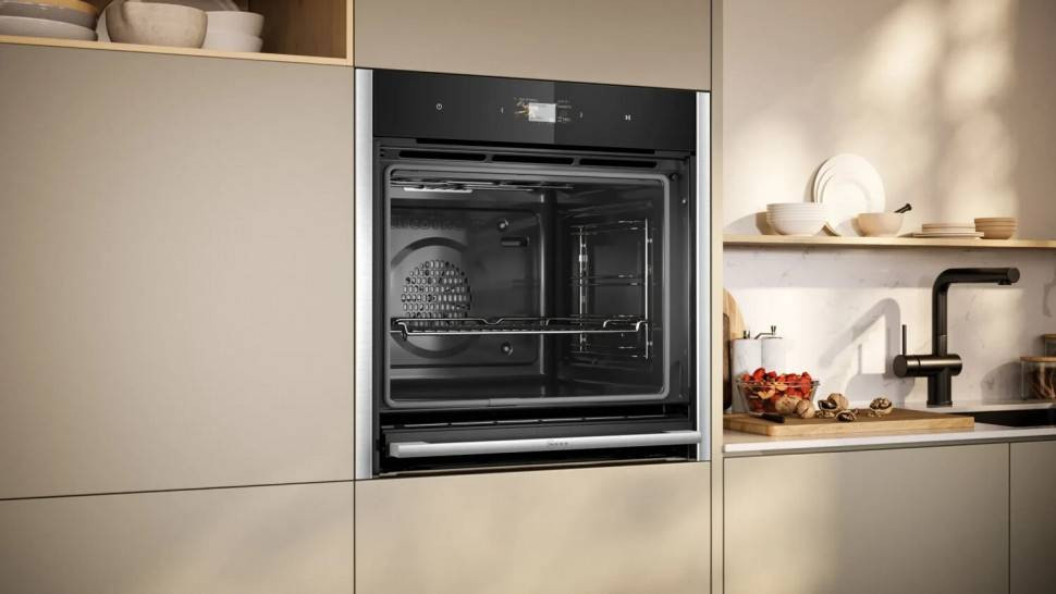 Управление прибором осуществляется с помощью сенсорных переключателей Full Touch Control, а на TFT дисплее отображается все необходимая информация. Электронный контроль температуры позволяет точно настроить режим приготовления, а функция Home Connect дает возможность управлять духовым шкафом дистанционно.