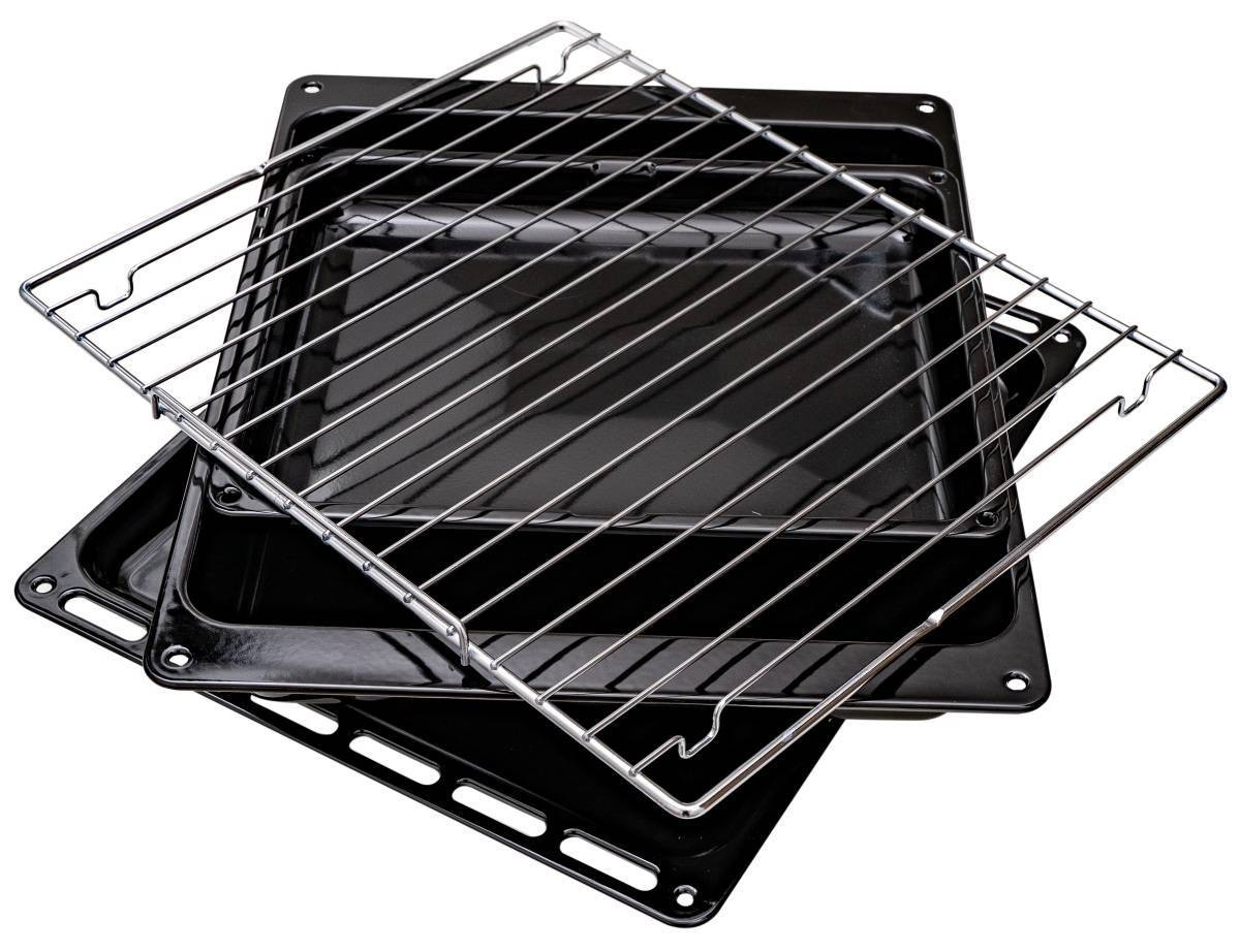 В комплекте: глубокий противень, 2 прямоугольных противня и хромированная решетка.