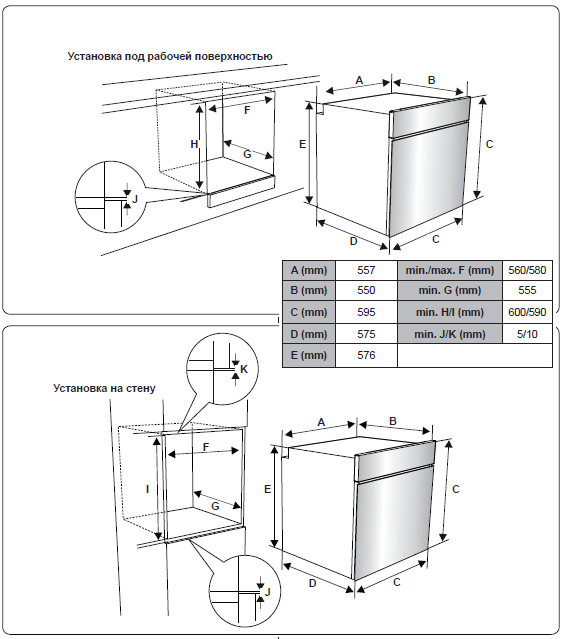 Размер ниши для встраивания в столешницу (ШхГхВ), мм: 560/580х555х600