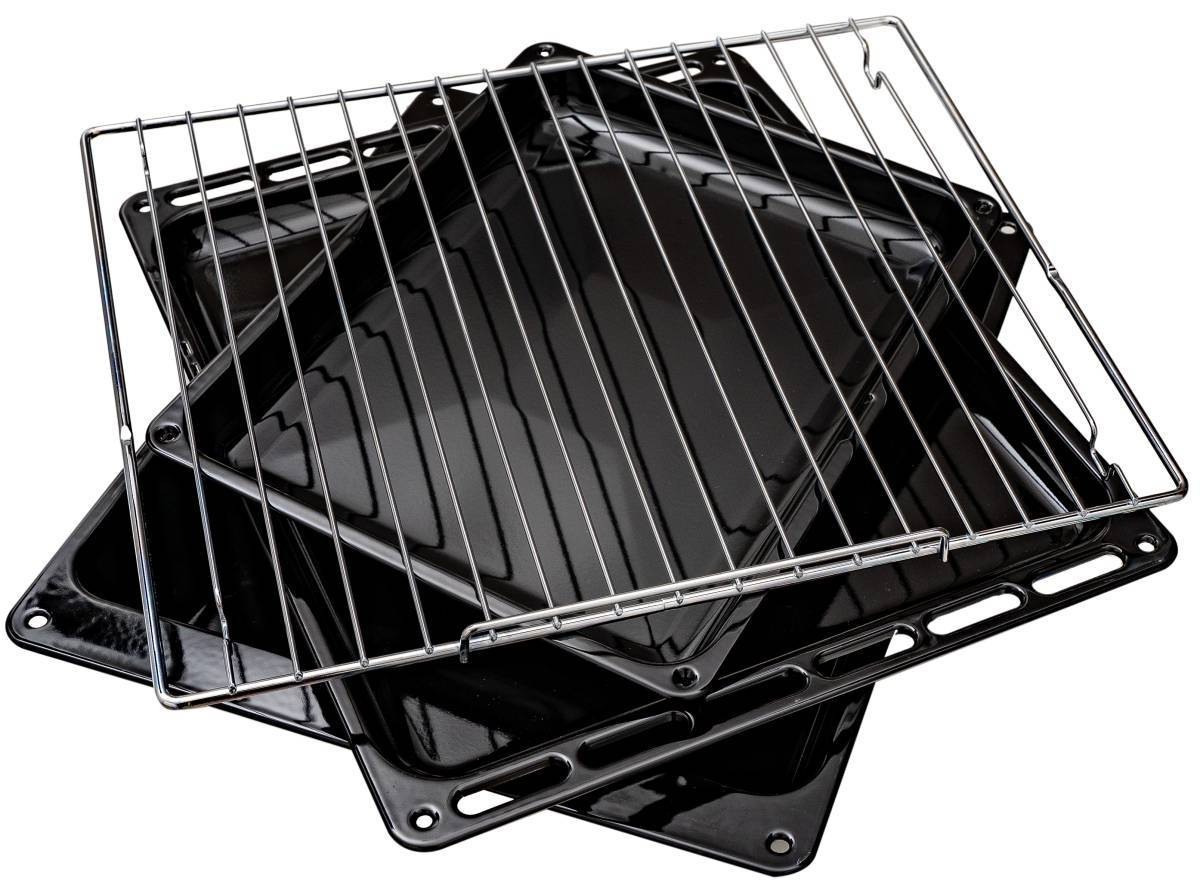 Комплектация: Хромированная решетка, 2 Универсальных противня с антипригарным покрытием Easy Clean, 1 глубокий (80 мм) противень с антипригарным покрытием Easy Clean