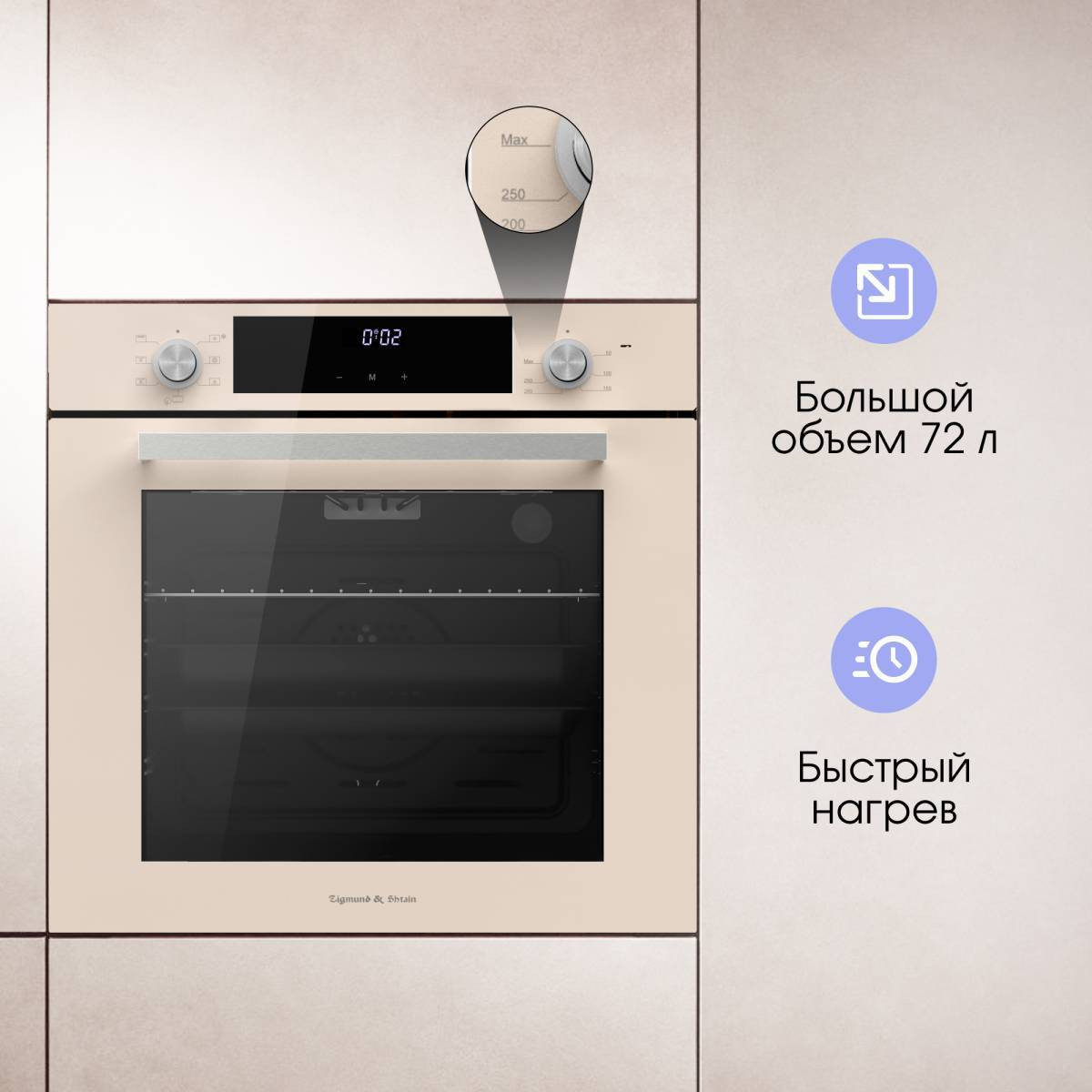 Объем камеры в 72 л с 5 уровнями установки противня на хромированных боковых направляющих позволит приготовить блюда любых размеров: запечь курицу целиком или испечь пирог на большую семью. В комплекте есть два противня (стандартный и глубокий) и съемная решетка.