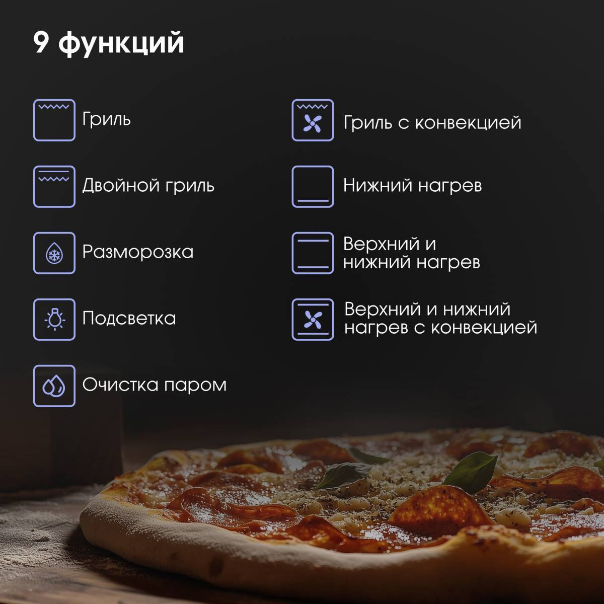 9 функций (гриль, двойной гриль, гриль с конвекцией, нижний нагрев, верхний и нижний нагрев, верхний и нижний нагрев с конвекцией, конвекция (разморозка), подсветка, очистка паром) помогут подобрать оптимальный способ приготовления как сложных рецептов, так и самых любимых блюд на каждый день.