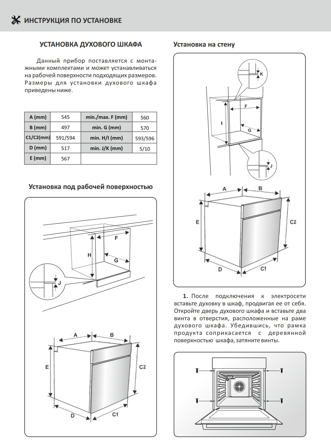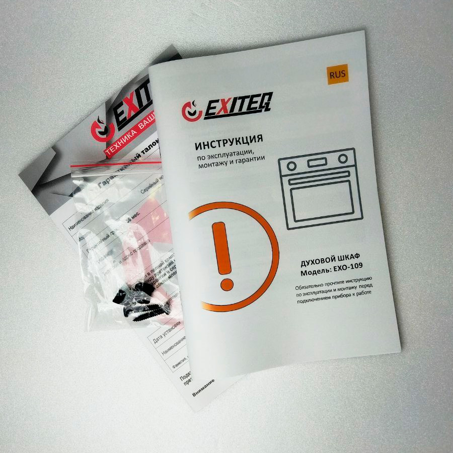 В комплекте: - Глубокий противень, глубиной 40 мм из эмалированной стали - Хромированная решётка - Универсальный противень стандартной глубины 20 мм из эмалированной стали - Вертел - Хромированная рамка для вертела - 2 винта для крепления духового шкафа в кухне - Инструкция по эксплуатации - Схема монтажа (в инструкции)