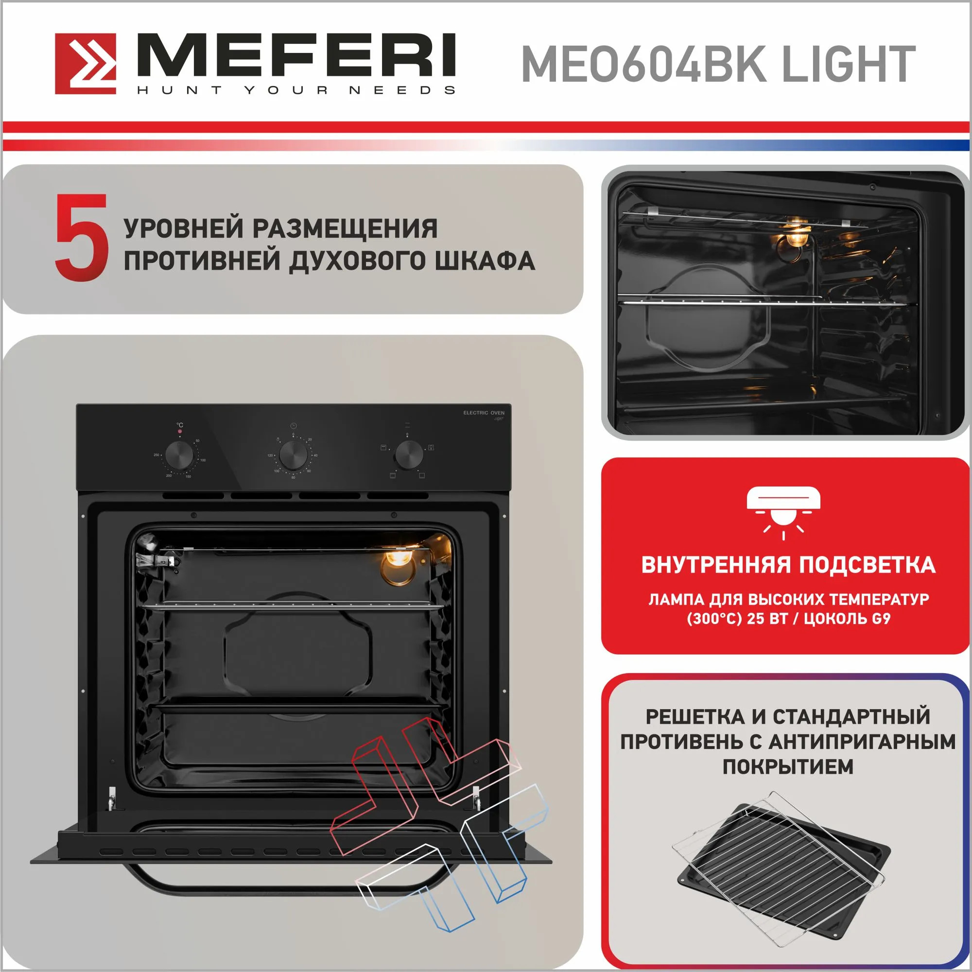 Современный Дизайн: Его элегантный корпус с металлической отделкой придаст вашей кухне современный вид.Продвинутая Система Очистки: Гидролизный метод очистки сделает процесс уборки быстрым и простым, позволяя вам наслаждаться готовкой, а не моющими средствами.Идеальный Гриль: Режим гриля позволяет приготовить блюда с аппетитной корочкой и неповторимым вкусом.Точное Время и Управление: Встроенный таймер и автоматическое выключение гарантируют точное приготовление ваших блюд.Разнообразие Режимов: Четыре режима приготовления предоставляют вам свободу для экспериментов и создания разнообразных блюд.Большой Объем: 60 литров полезного объема шкафа позволяют готовить даже большие блюда для всей семьи.ХарактеристикиТип управления: МеханическоеКласс энергетической эффективности: АПолезный объем, л: 60Гриль: ДаРежим конвекции: ДаКоличество режимов работы: 4Ширина, мм: 595Высота, мм: 590Глубина, мм: 533Вес товара без упаковки (нетто), кг: 26.5Производитель: MEFERIТаймер: ДаМатериал корпуса: МеталлВнутреннее покрытие: Эмаль легкой очисткиКоличество стекол в дверце: 2Максимальная температура, С: 250Тип гриля: ЭлектрическийТип очистки: ГидролизнаяДисплей: НетТелескопические направляющие: Нет