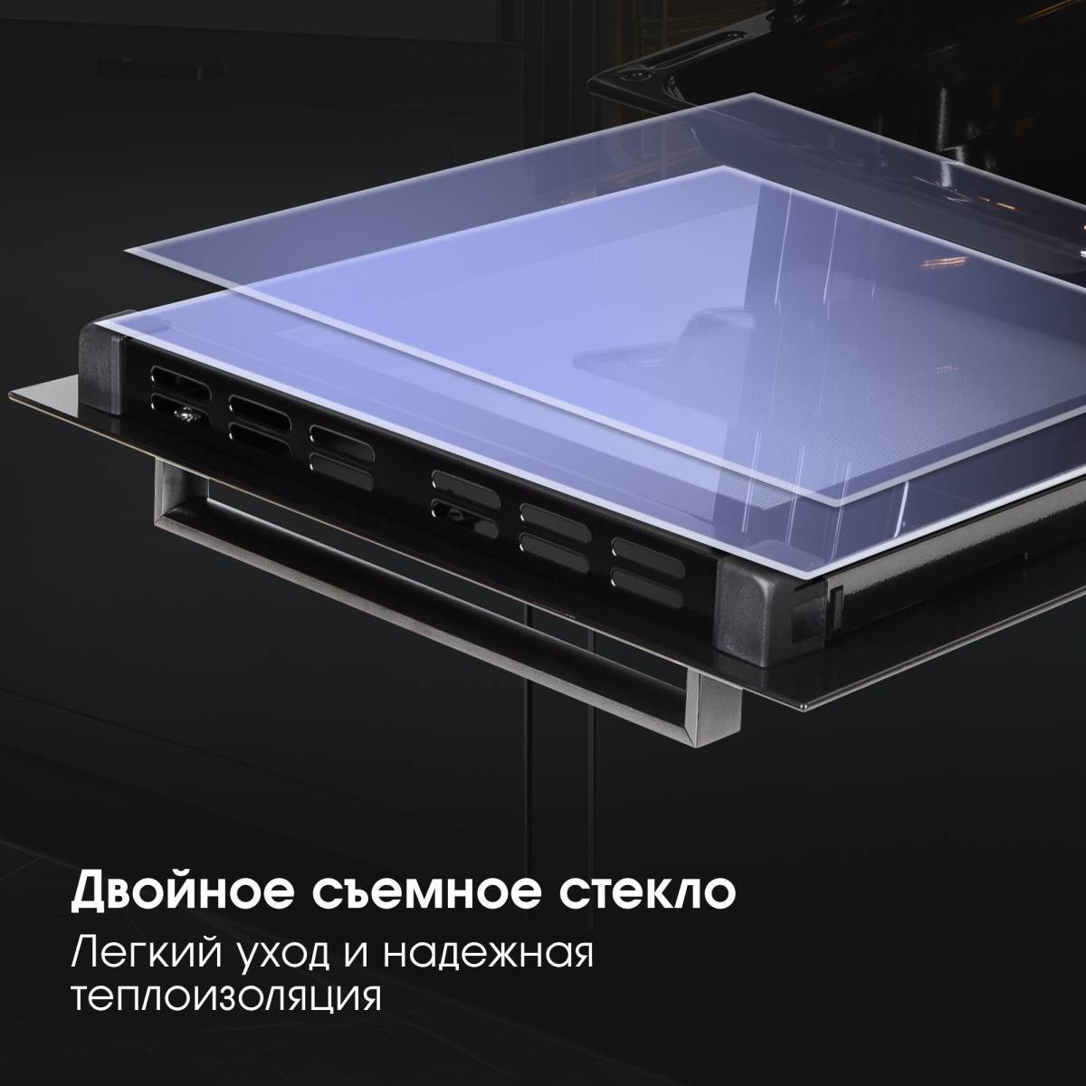 Дверца с двойным стеклом и холодным фронтом обеспечит качественную термоизоляцию и минимизирует риск обжечься во время эксплуатации. Стекла можно легко снять.