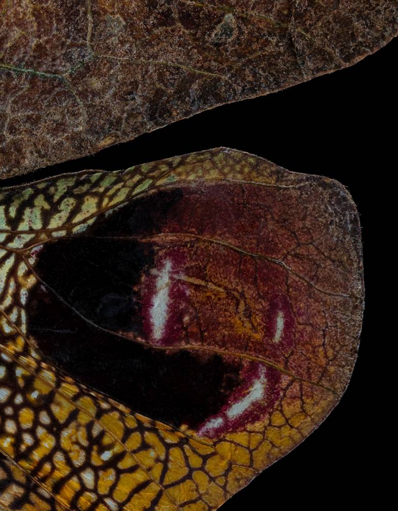 Удивительное насекомое, обитающее в тропических лесах Южной Америки. Его название буквально означает «пурпурный глаз с зелёными листьями». Этот вид клопов достиг совершенства в искусстве мимикрии – его тело имитирует не просто лист, а именно молодой, слегка повреждённый, с характерными пятнами и неровными краями. Помимо визуальной маскировки, насекомое выделяет феромоны, делающие его «невидимым» для хищников на химическом уровне. При опасности оно не просто замирает, а начинает медленно раскачиваться, точно лист на ветру. Интересно, что окраска этих клопов меняется в зависимости от сезона, повторяя жизненный цикл растений.