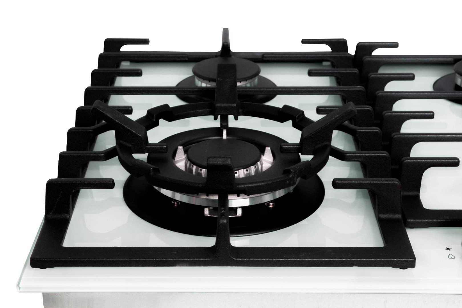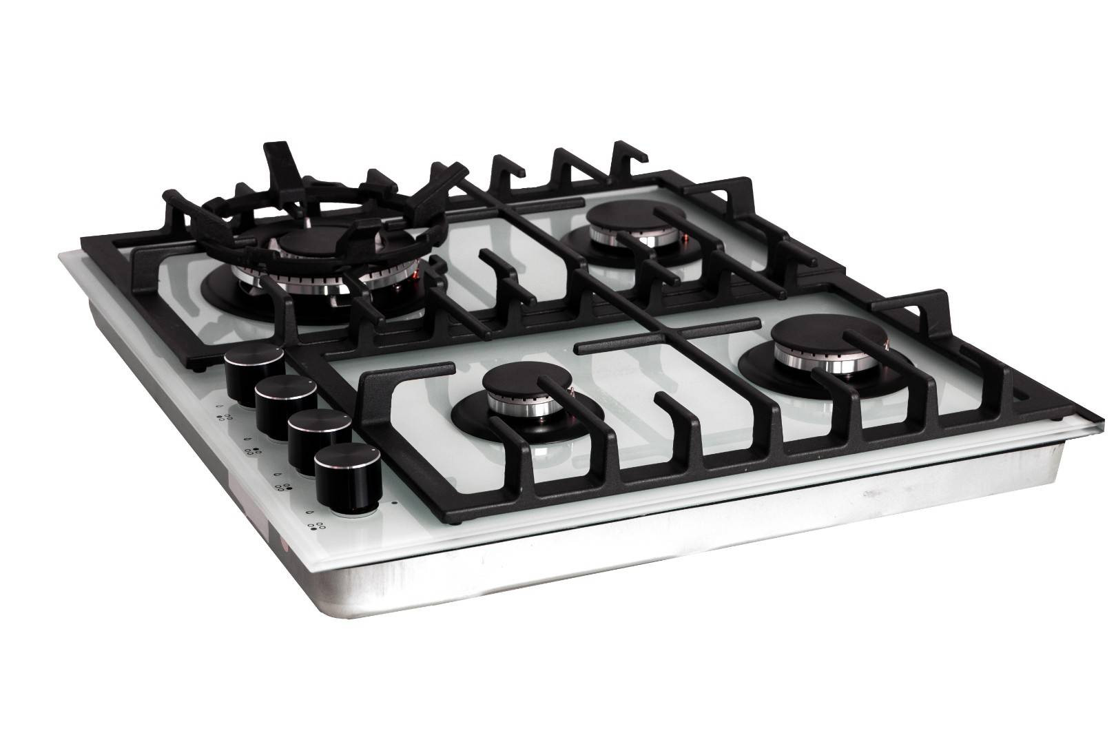 Конфорки мощностью: 1 wok-конфорка с тройным пламенем 3,80 кВт, 2 средние конфорки 1,75 кВт, 1 малая вспомогательная конфорка 1,00 кВт