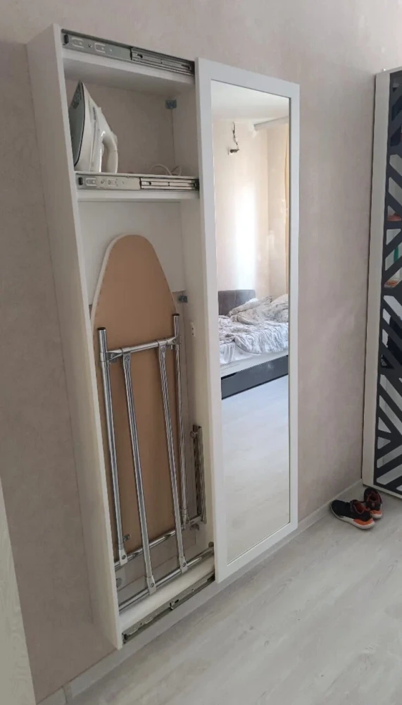 Фасад шкафа со встроенной гладильной доской - большое зеркало в полный рост, которое сдвигается влево как дверь купе. Широкая гладильная доска из влагостойкого материала без перфорации (дерево) крепится к стене на мощном кронштейне. Механизм раскладывания гладильной доски стальной и бесшумный, который будет Вам служить годами, выдерживает нагрузку в 25 килограмм. Экономия места потрясающая. Также в шкафчике есть полочка для хранения утюга и его аксессуаров.