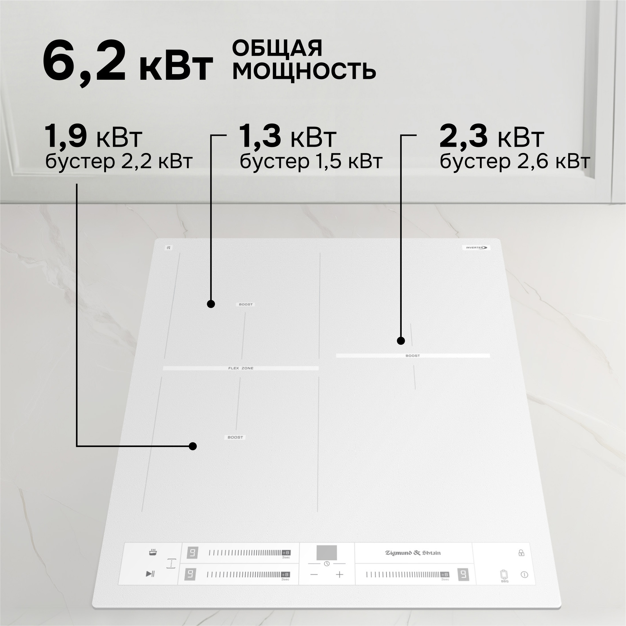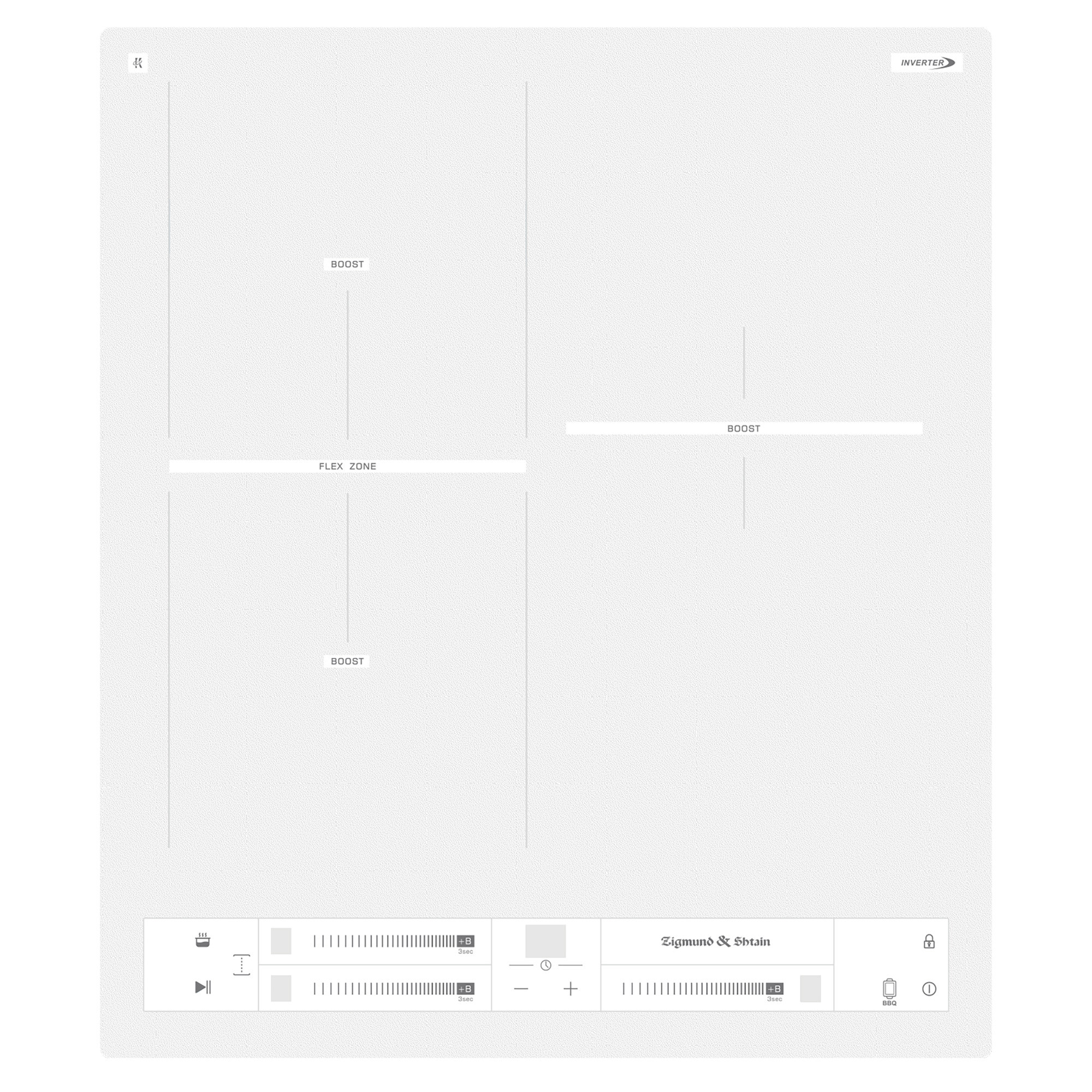 Три зоны нагрева с мощностью 1900/2200 Вт, 1300/1500 Вт, 2300/2600 Вт, а также FLEX-зона с мощностью 3000/3600 Вт позволяют быстро и комфортно приготовить любимые блюда.