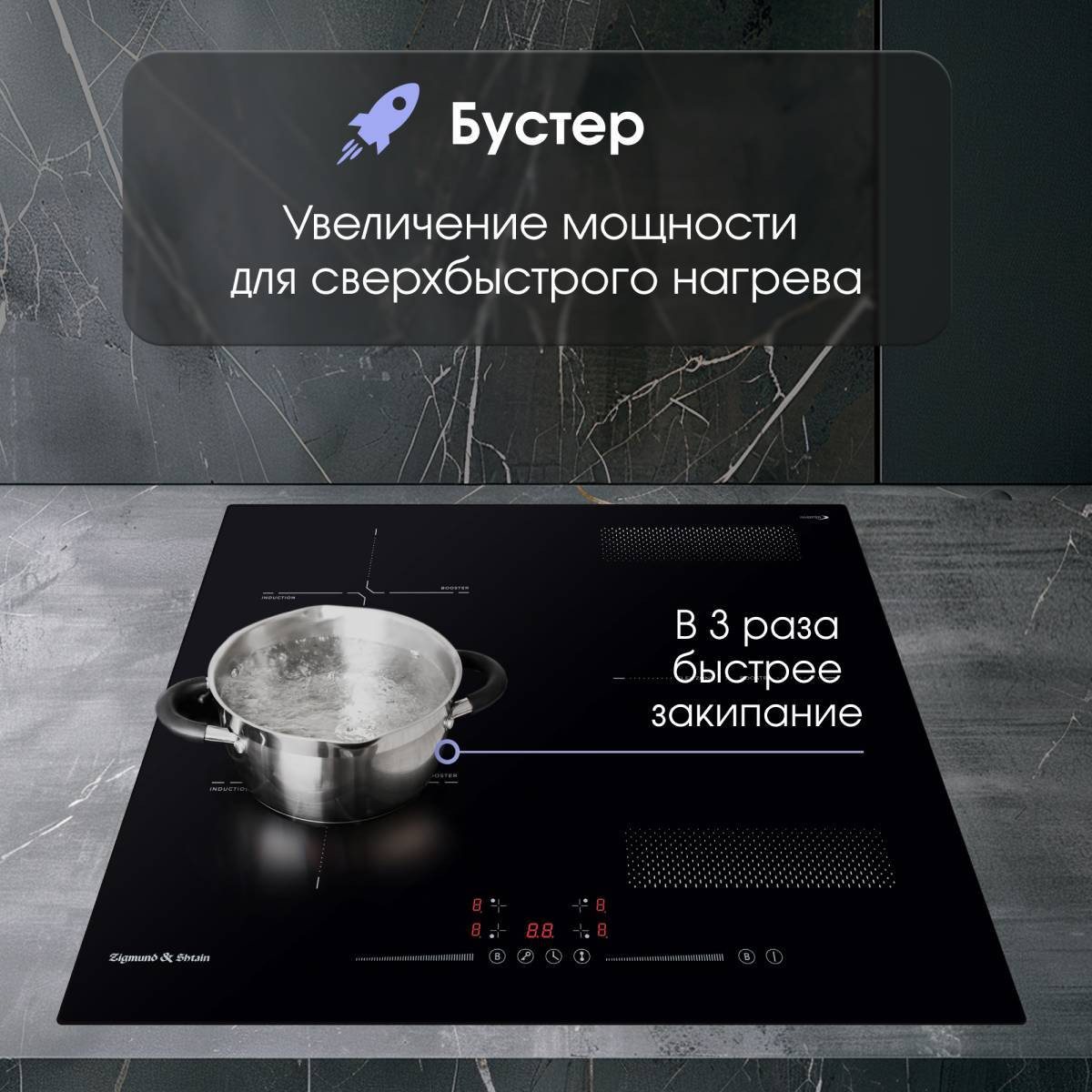 Функция «Бустер», имеющаяся на каждой конфорке, позволяет кратковременно увеличить мощность нагрева до максимума, чтобы в 2-3 раза сократить время доведения воды, молока или супа до кипения.