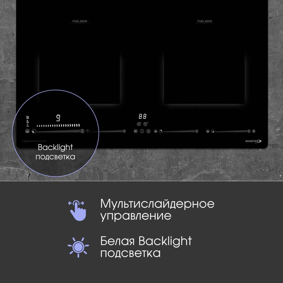 Сенсорная панель с мультислайдером и белой Backlight подсветкой делает управление интуитивно понятным. Чтобы включить прибор и выставить нужную мощность нагрева, не нужны физические усилия. Достаточно коснуться кнопки включения и индикатора конфорки, а затем провести пальцем по слайдеру левой или правой зоны, пока на LED-дисплее не появится нужная мощность.