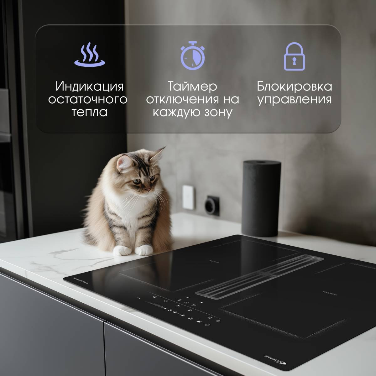 Также благодаря индукции панель не нагревается также сильно, как обычные стеклокерамические плиты, а значит быстрее остывает и снижает вероятность получить ожог при соприкосновении с конфорками.