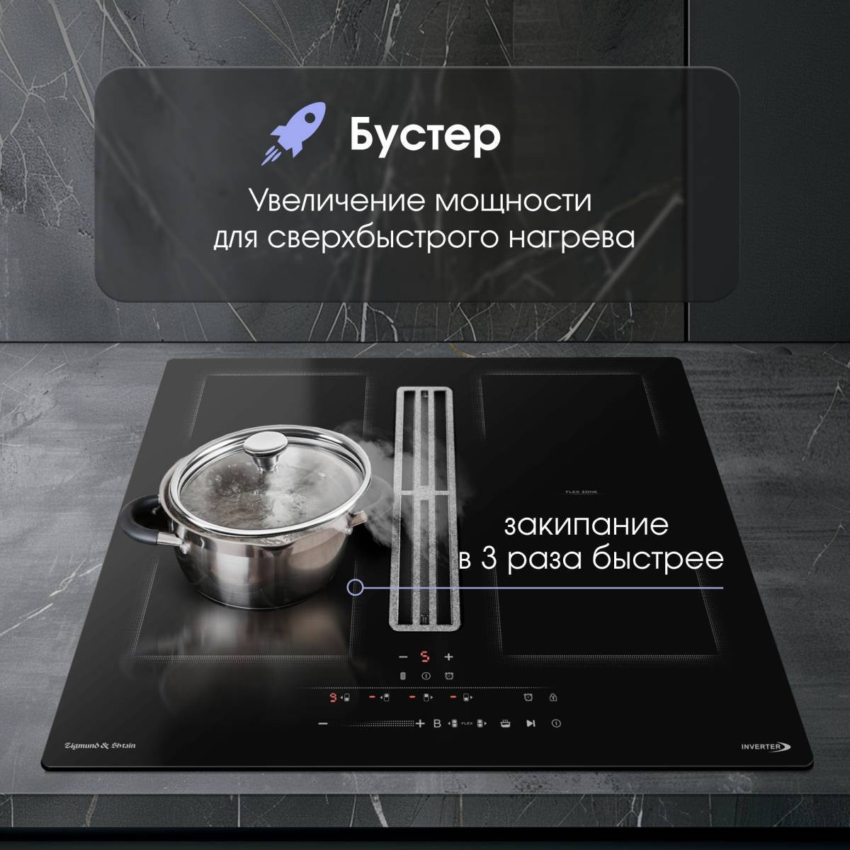 Функция «Бустер» включает конфорку на максимальную мощность, что позволяет в разы быстрее нагреть, например, кастрюлю с водой до кипения.