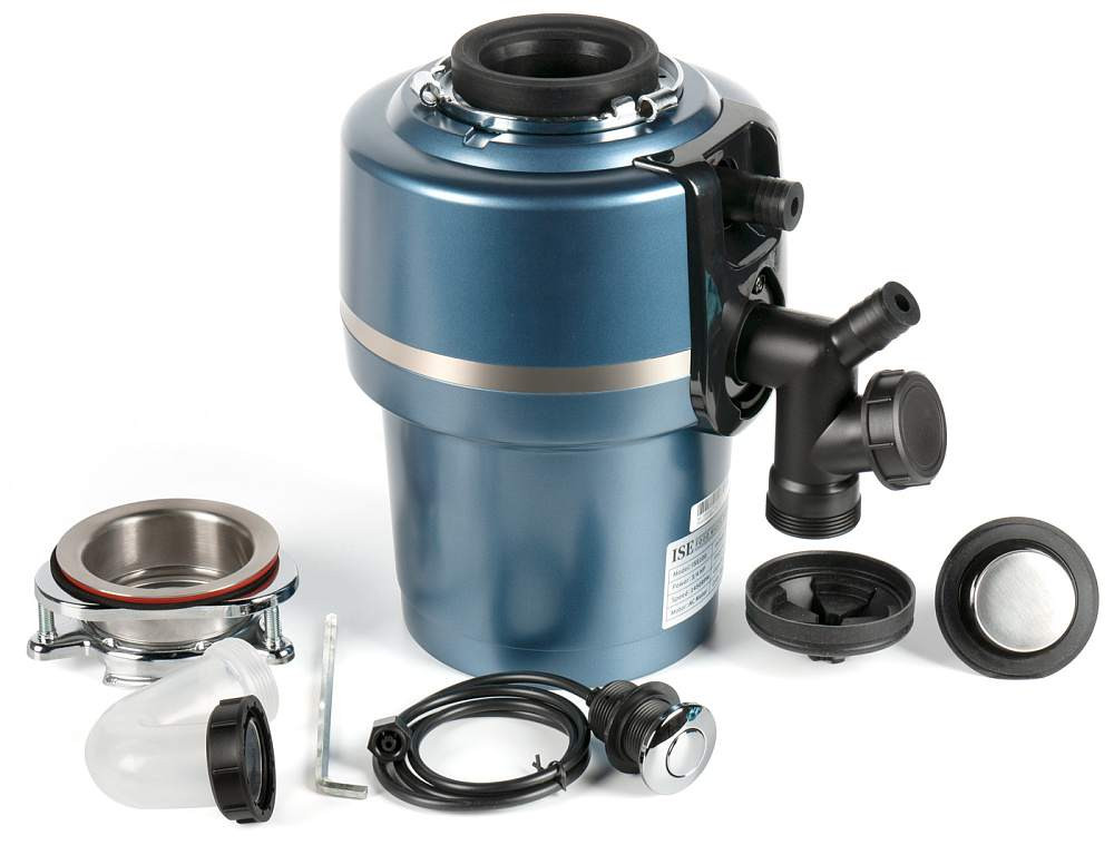 Комплектация: Измельчитель пищевых отходов со встроенным блоком пневмопуска, встраиваемая кнопка пневмовыключателя, заглушка-толкатель, фланец в сборе, брызгозаградительное кольцо, выпускное колено с отводом для посудомоечной машины, кабель 1 м с вилкой, инструкция.