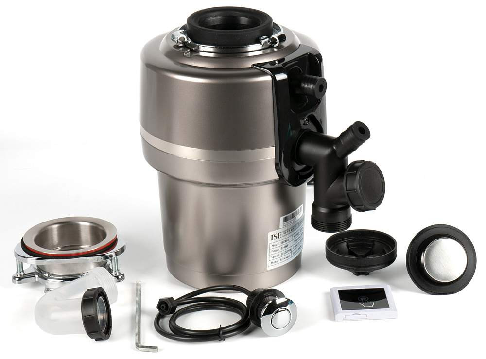 Комплектация: Измельчитель пищевых отходов со встроенным блоком пневмопуска, встраиваемая кнопка пневмовыключателя, пульт дистанционного управления, заглушка-толкатель, фланец установки на мойку в сборе, брызгозаградительное кольцо, выпускное колено с отводом для посудомоечной машины, кабель 1 м с вилкой, инструкция.