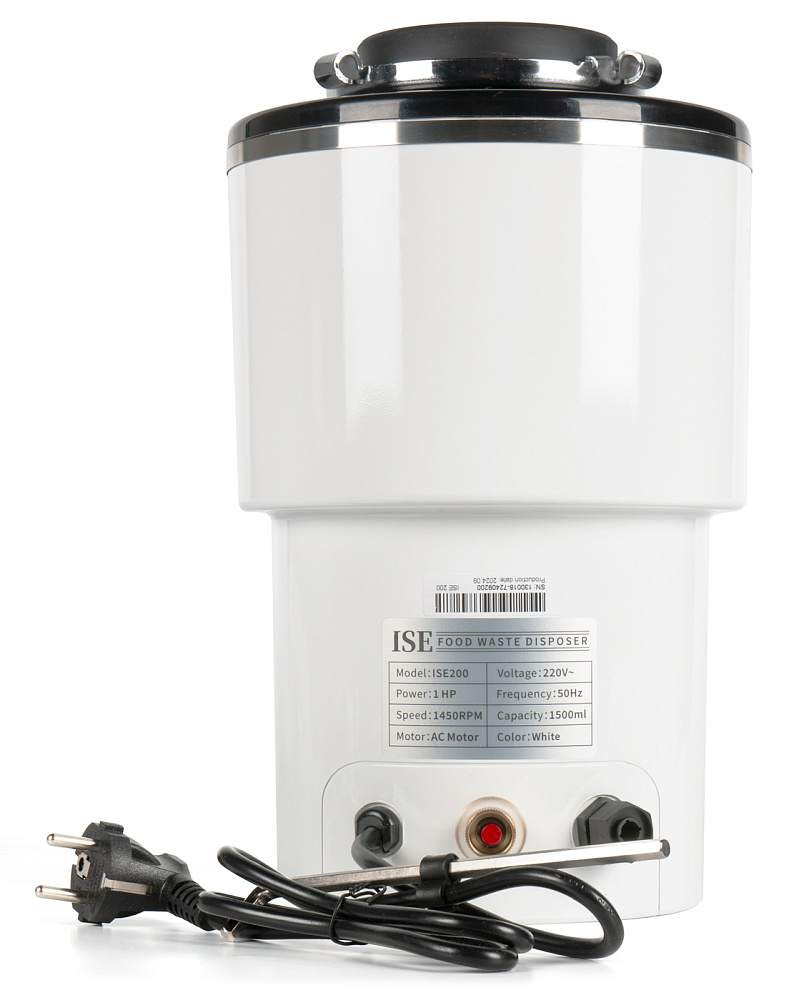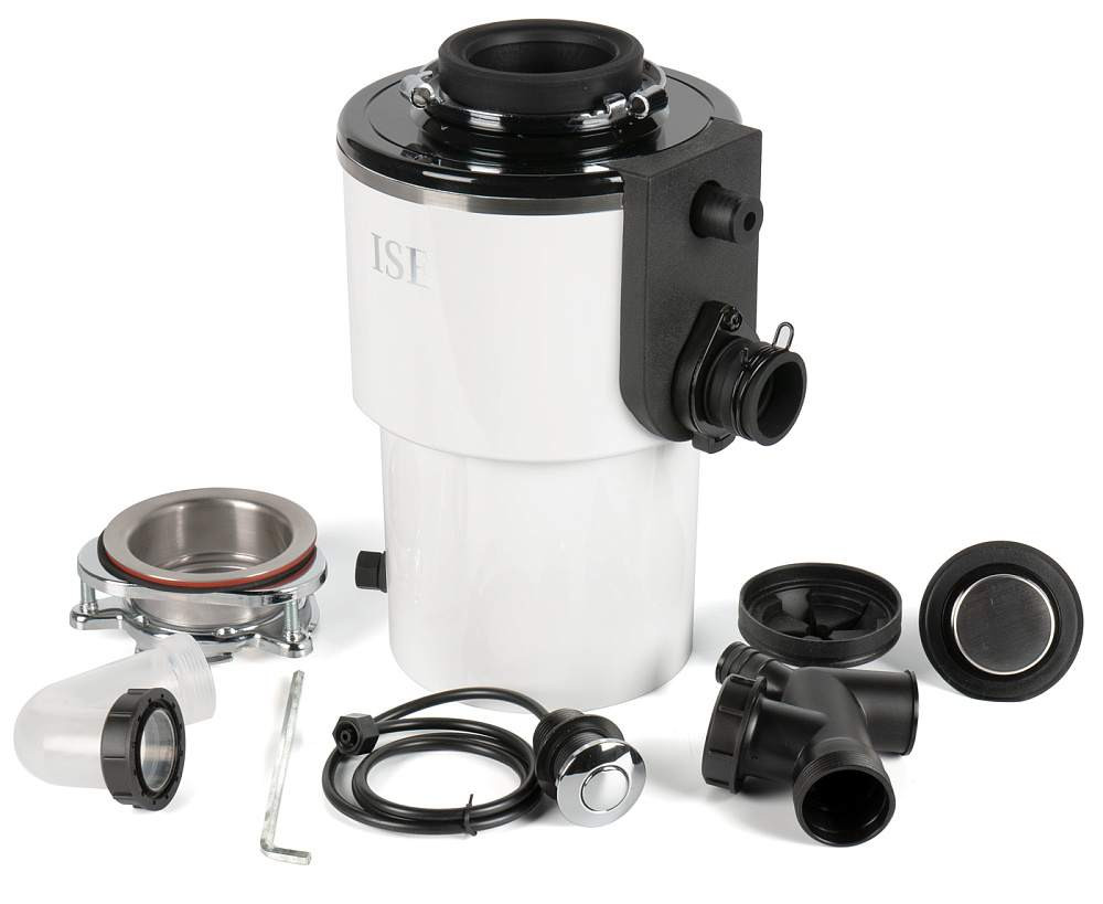 Комплектация: Измельчитель пищевых отходов со встроенным блоком пневмопуска, встраиваемая кнопка пневмовыключателя, заглушка-толкатель, фланец в сборе, брызгозаградительное кольцо, выпускное колено с отводом для посудомоечной машины, кабель 1 м с вилкой, инструкция.