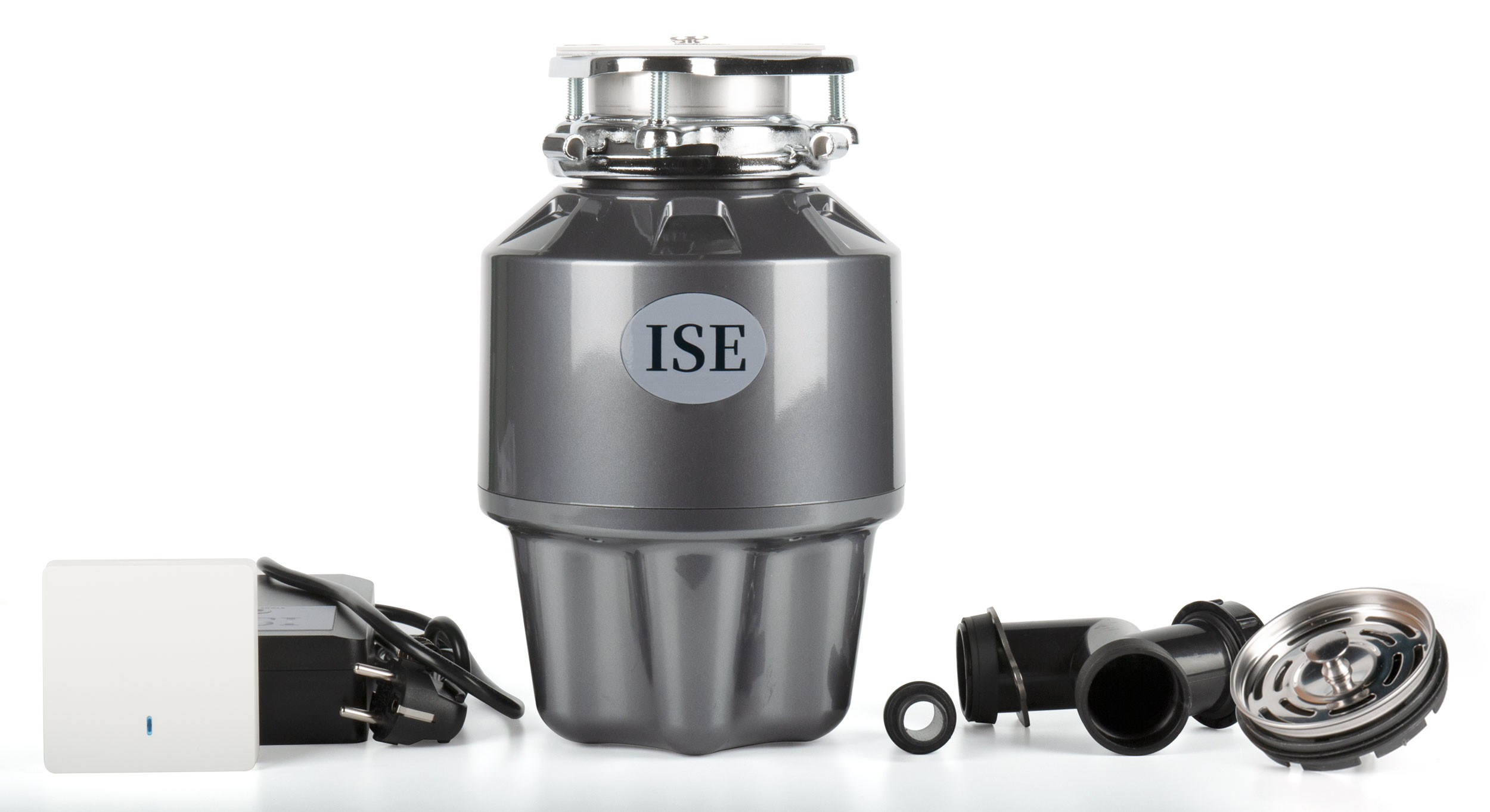 Комплектация: Измельчитель пищевых отходов со встроенным блоком пневмопуска, встраиваемая кнопка пневмовыключателя, пульт дистанционного управления, батарейка CR2032, проталкиватель, фильтрующая сетка с резиновой пробкой, фланец установки на мойку в сборе, брызгозаградительное кольцо, выпускное колено с отводом для посудомоечной машины, кабель 1 м с вилкой, монтажный набор, инструкция.